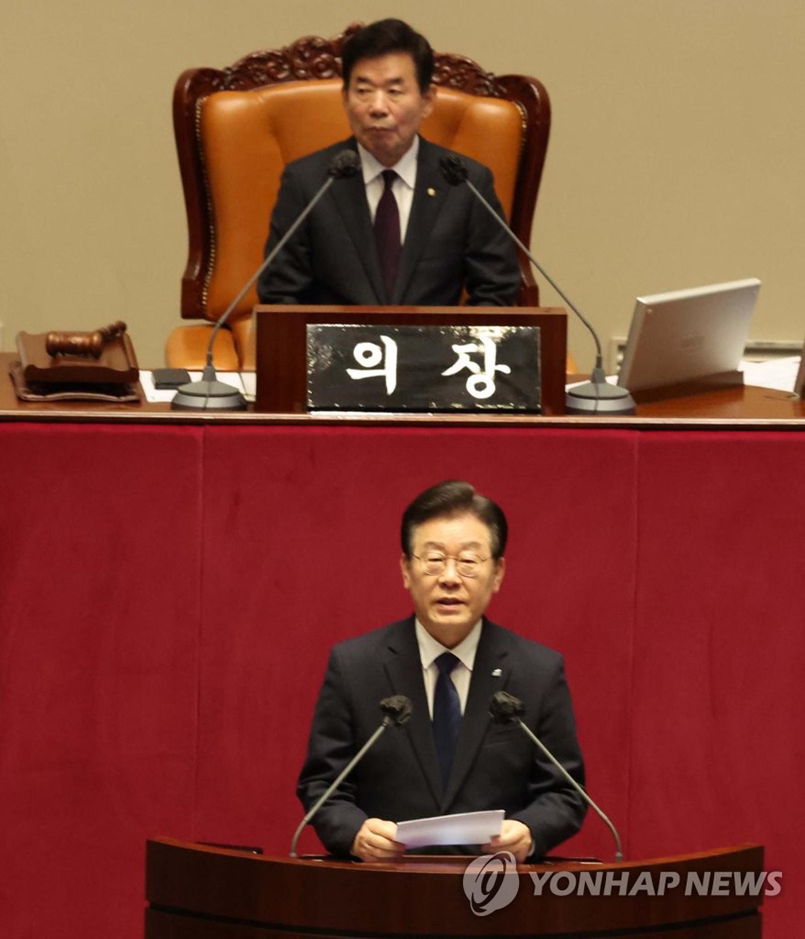 Ông Lee Jae-myung (dưới), người đứng đầu Đảng Dân chủ đối lập chính, khẳng định sự bất công trong đề nghị của cơ quan công tố xin ý kiến Quốc hội về việc bắt giữ ông vì một loạt cáo buộc tham nhũng, tại phiên họp toàn thể của Quốc hội ở Seoul, ngày 27/2/2023, trước khi Quốc hội tiến hành bỏ phiếu liên quan đến vấn đề này. Ảnh: Yonhap