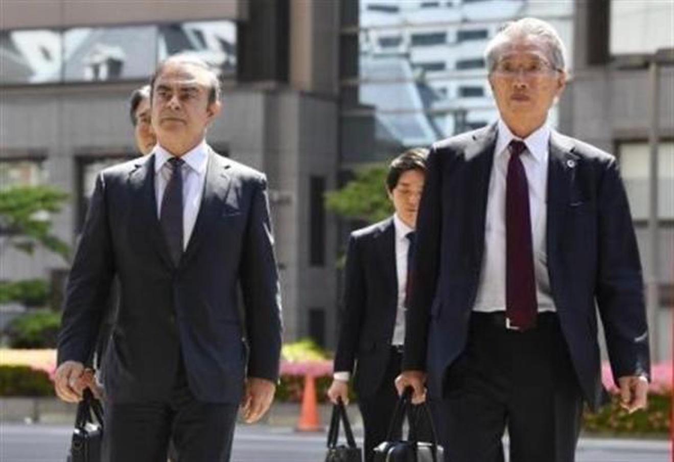 Cựu Chủ tịch Tập đoàn sản xuất ô tô Nissan của Nhật Bản Carlos Ghosn (trái, phía trước) tới Tòa án quận Tokyo ngày 23/5/2019. Ảnh: Kyodo/TTXVN