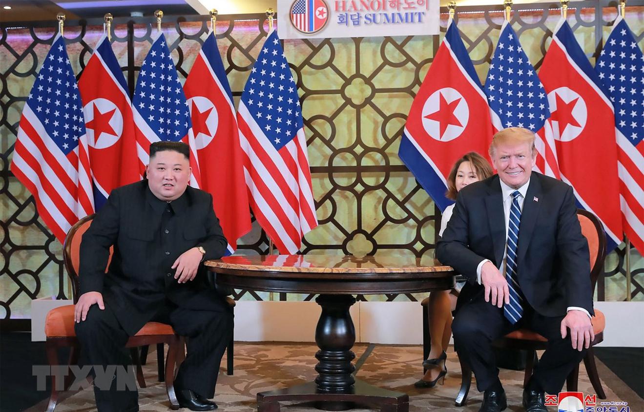 Tổng thống Mỹ Donald Trump (phải) và nhà lãnh đạo Triều Tiên Kim Jong-un (trái) tại cuộc gặp ở Hà Nội ngày 28/2/2019. (Ảnh: AFP/TTXVN)