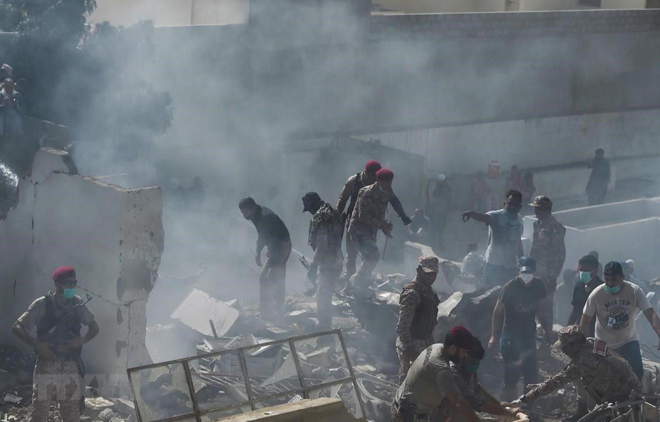 Lực lượng cứu hộ tìm kiếm nạn nhân tại hiện trường vụ rơi máy bay ở Karachi, Pakistan. (Ảnh: AFP/TTXVN)