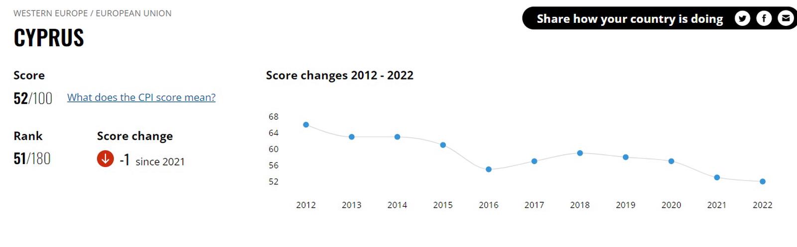 Síp được xếp hạng 51 vào năm 2022, với 52 điểm CPI, giảm tới 12 điểm so với năm 2012.