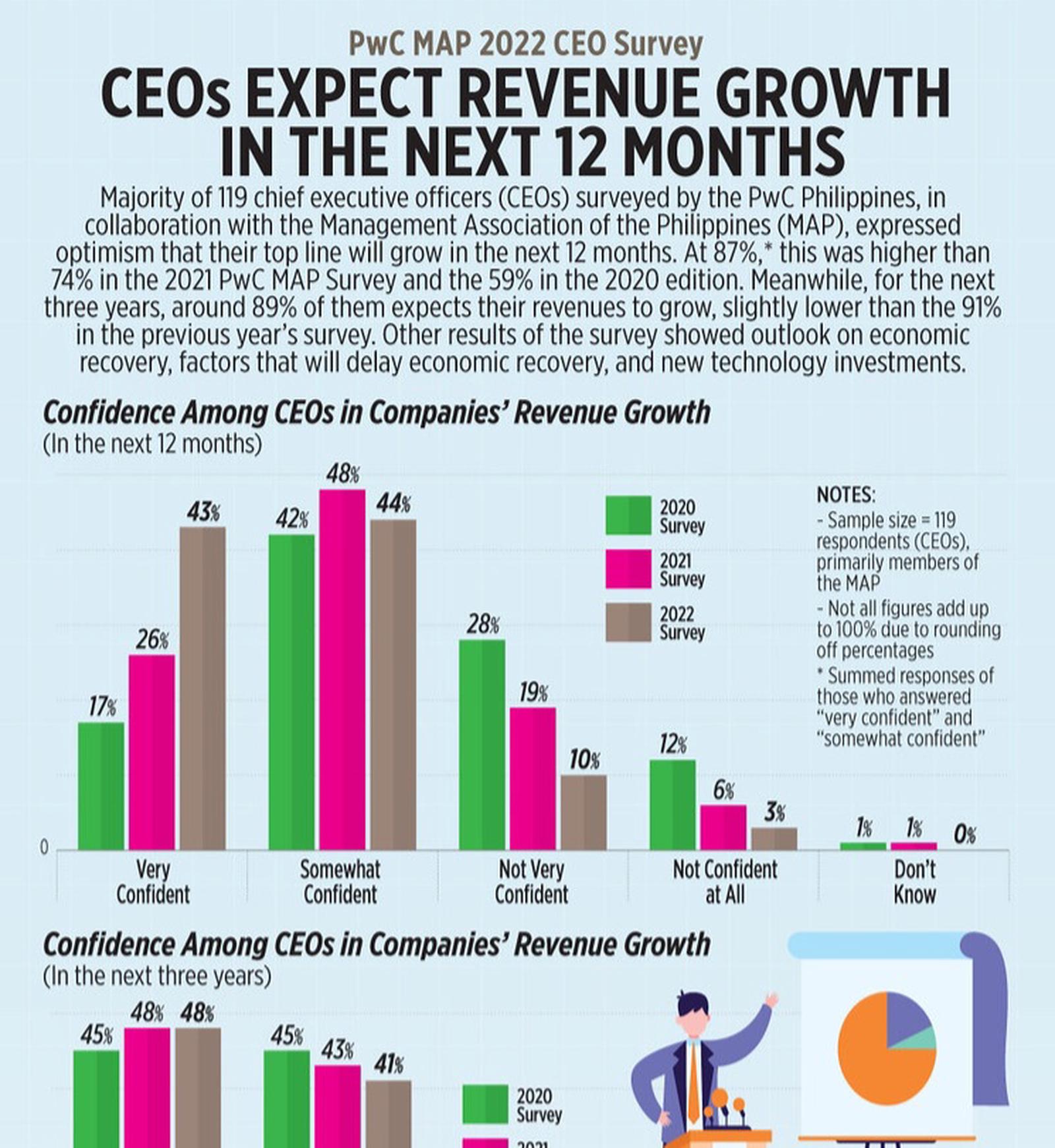 Tuy nhiên, ở cấp độ kinh tế vĩ mô, 52% CEO tin rằng, nền kinh tế Philippines vẫn cần hơn 2 năm để phục hồi sau tác động của đại dịch COVID-19, báo cáo khảo sát của PwC MAP 2022 CEO Philippines cho biết.