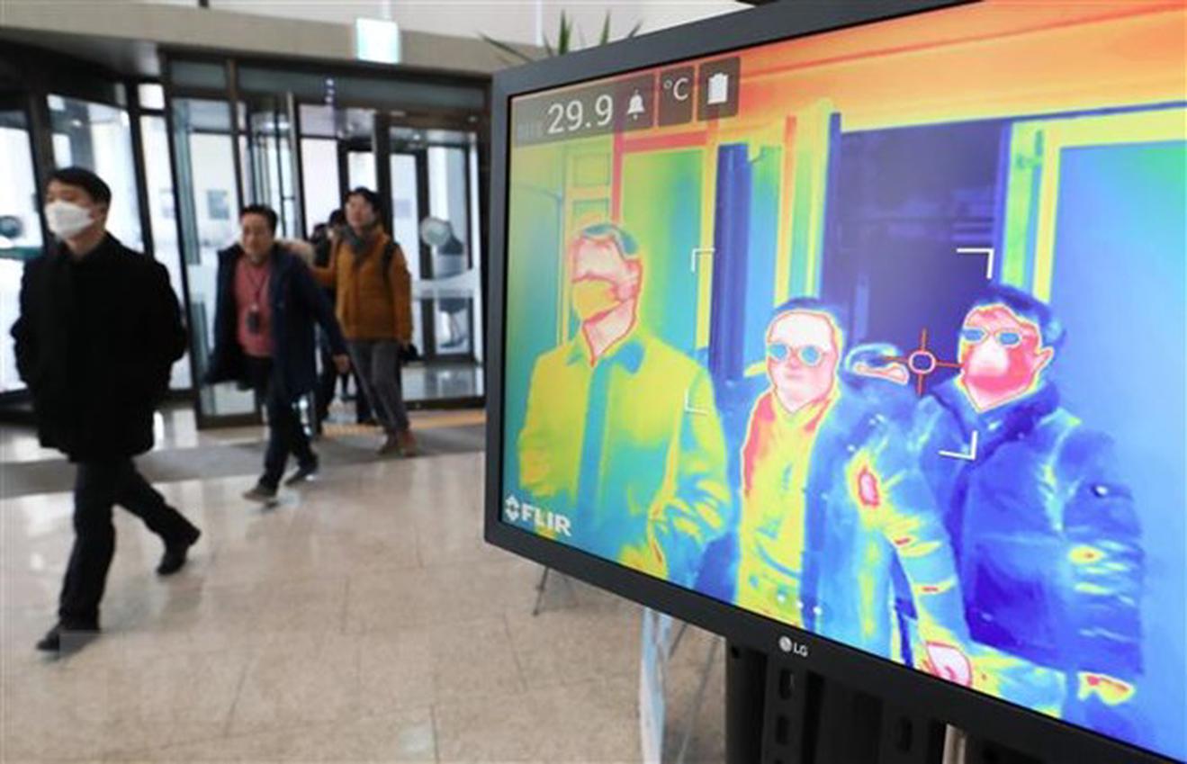 Máy quét thân nhiệt được lắp đặt tại khu nhà Chính phủ ở Sejong, Hàn Quốc, ngày 24/2/2020. (Ảnh: Yonhap/ TTXVN)
