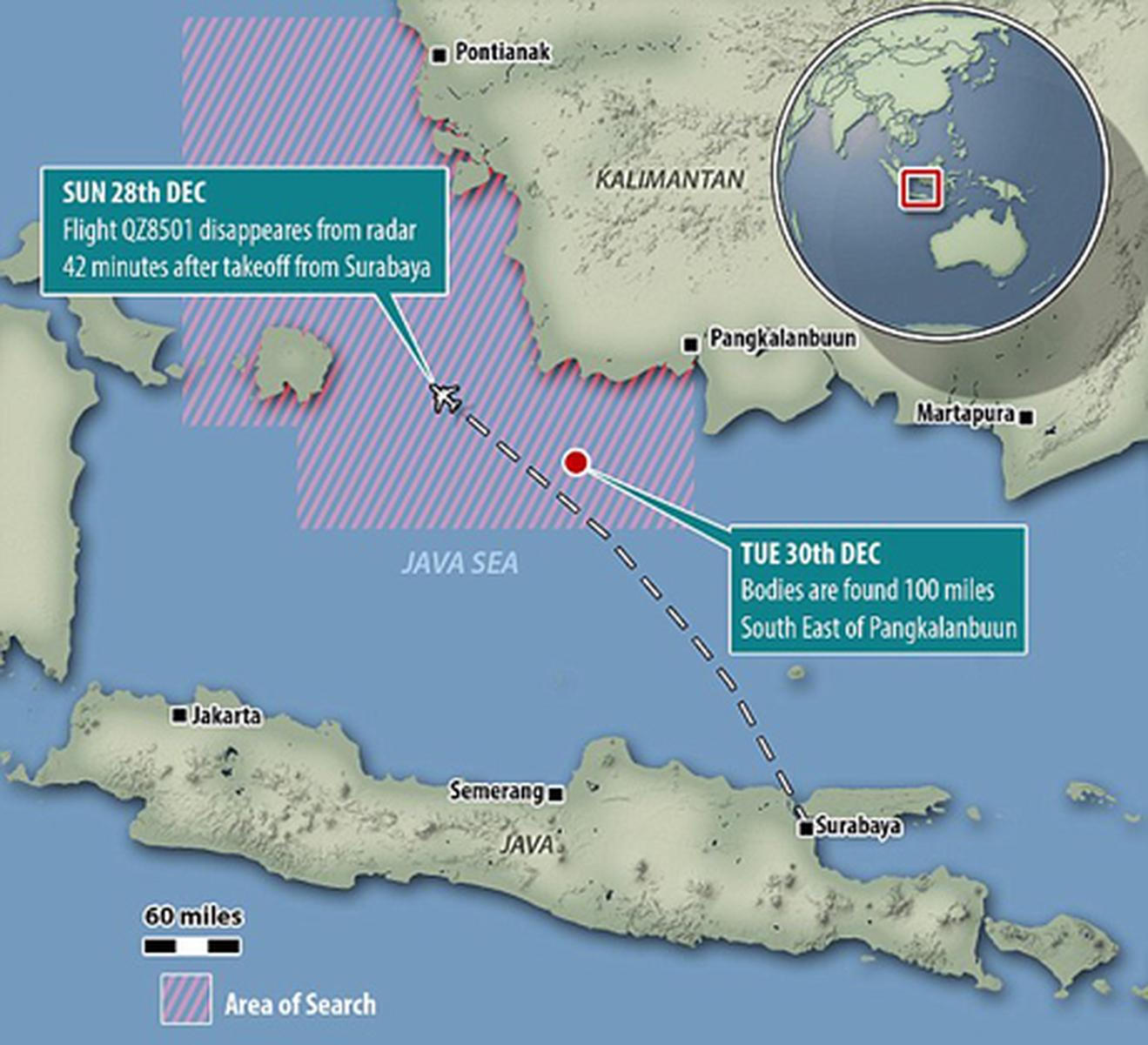 Các mảnh vỡ và thi thể nạn nhân được tìm thấy trên biển Java, gần nơi máy bay QZ8501 mất liên lạc.