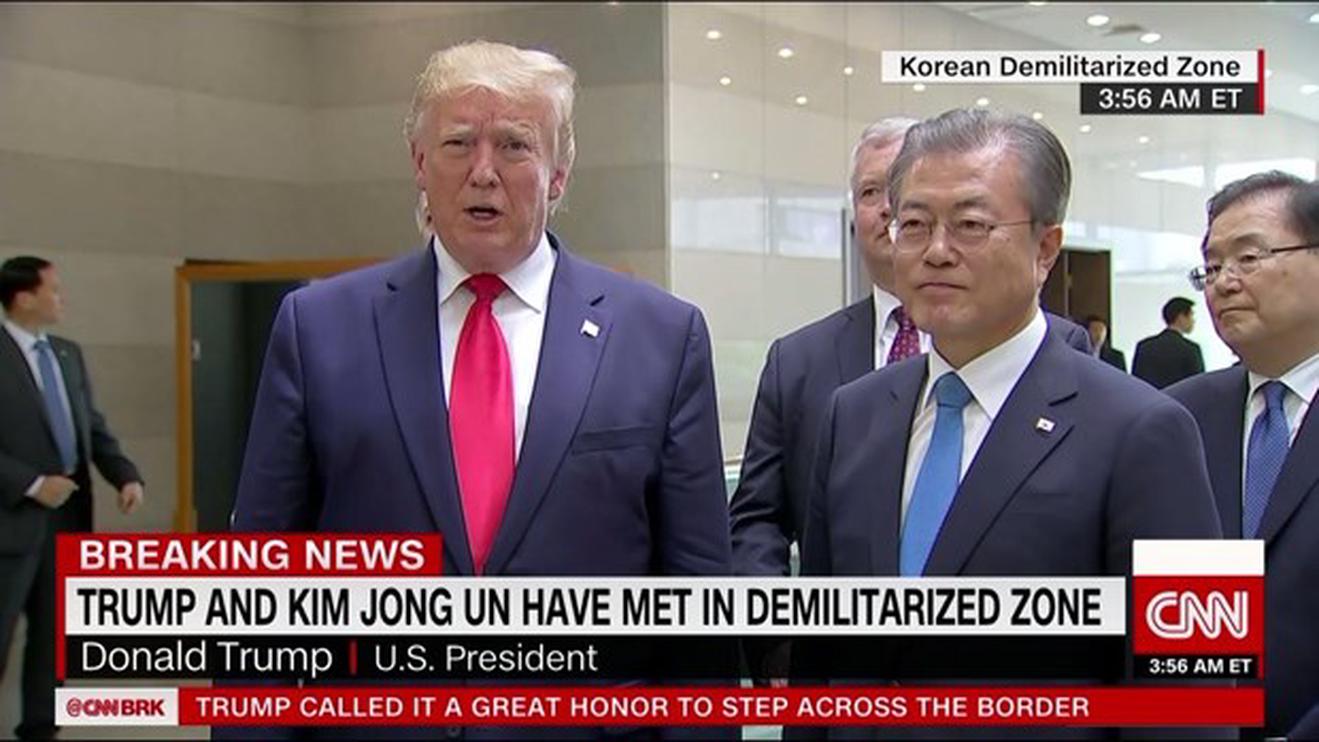 Tổng thống Mỹ Donald Trump phát biểu trước báo chí bên cạnh Tổng thống Hàn Quốc Moon Jae-in sau cuộc gặp song phương với nhà lãnh đạo Triều Tiên Kim Jong-un ở DMZ. (Nguồn: CNN)