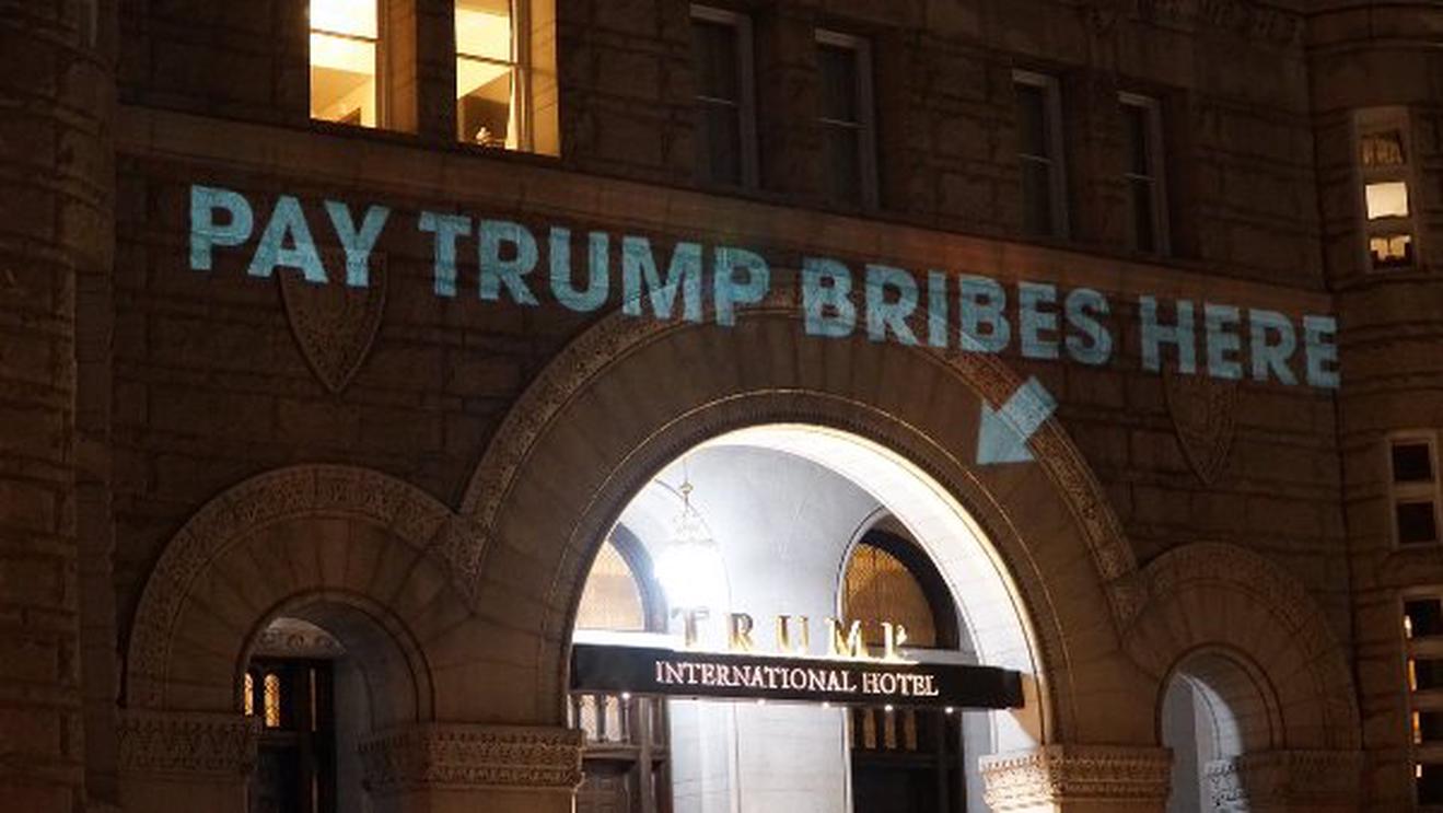 Câu khẩu hiệu "Đây là nơi hối lộ ông Trump" được trình chiếu ngay trên cửa chính Khách sạn Trump. Ảnh: Robin Bell