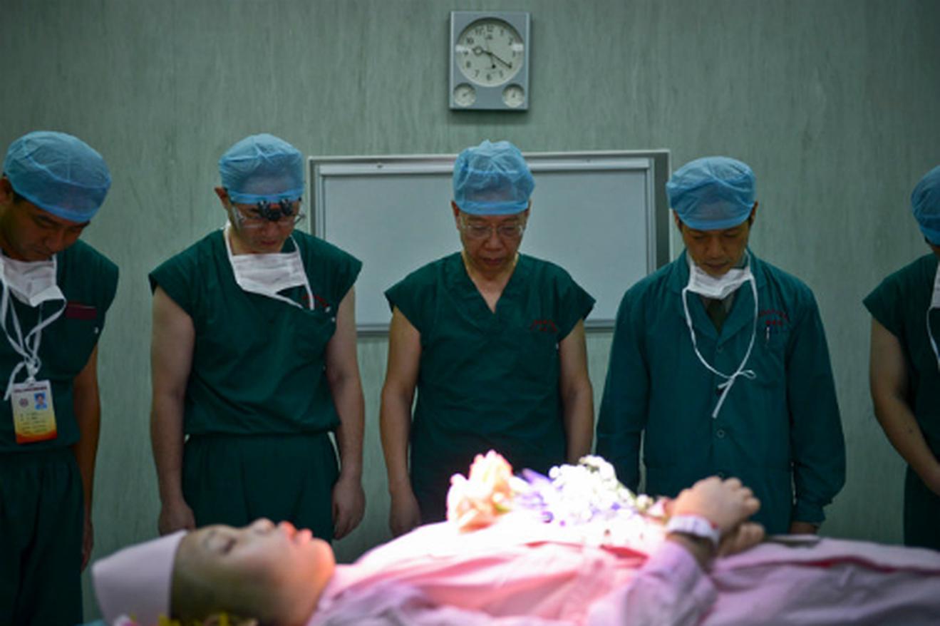 Bác sĩ Trung Quốc cúi đầu trước thi thể một bệnh nhân tự nguyện hiến tạng. Ảnh: Reuters.