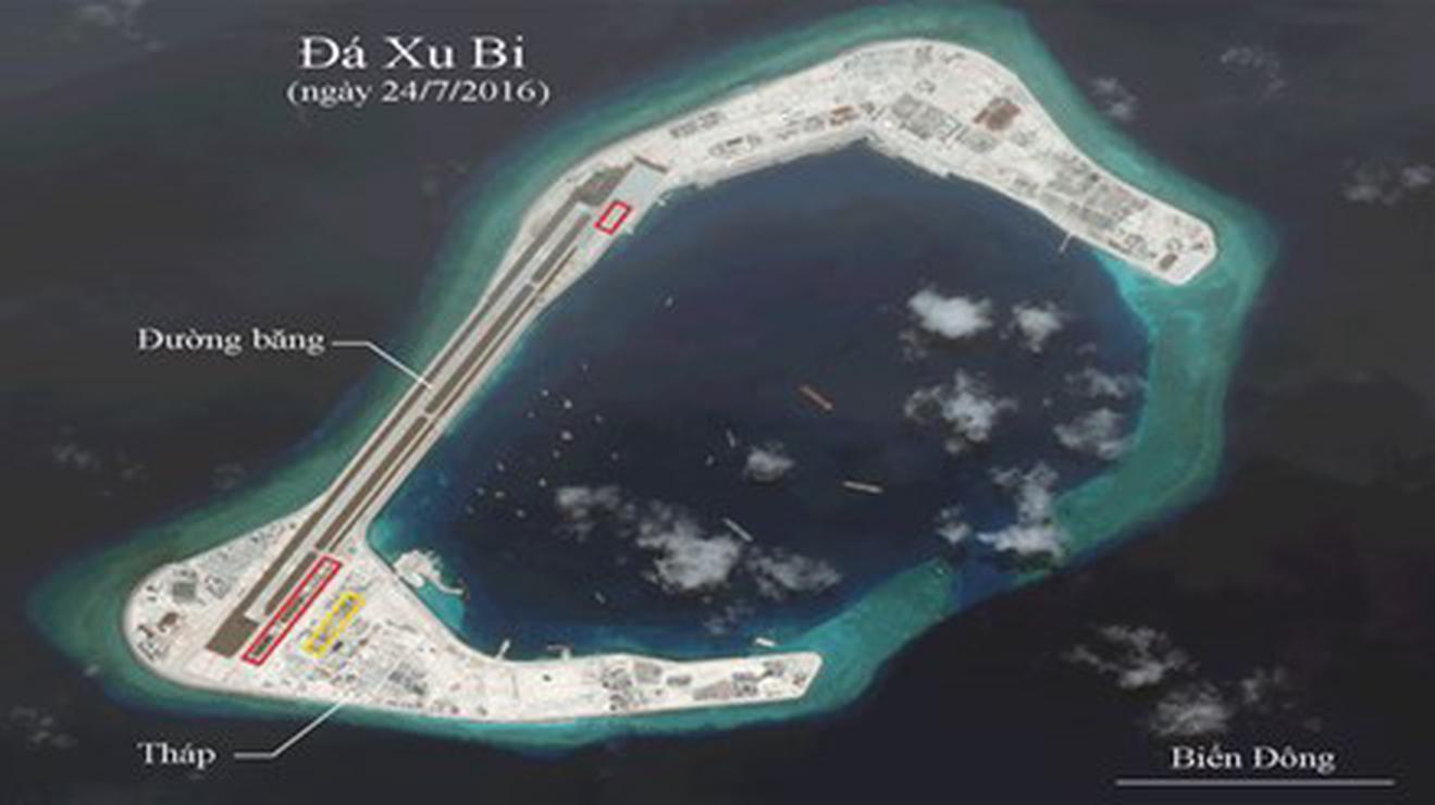 Trung Quốc xây dựng trái phép đường băng, tháp, nhà chứa máy bay... trên Đá Xu Bi. Ảnh chụp từ vệ tinh ngày 24/7/2016. Ảnh: New York Times