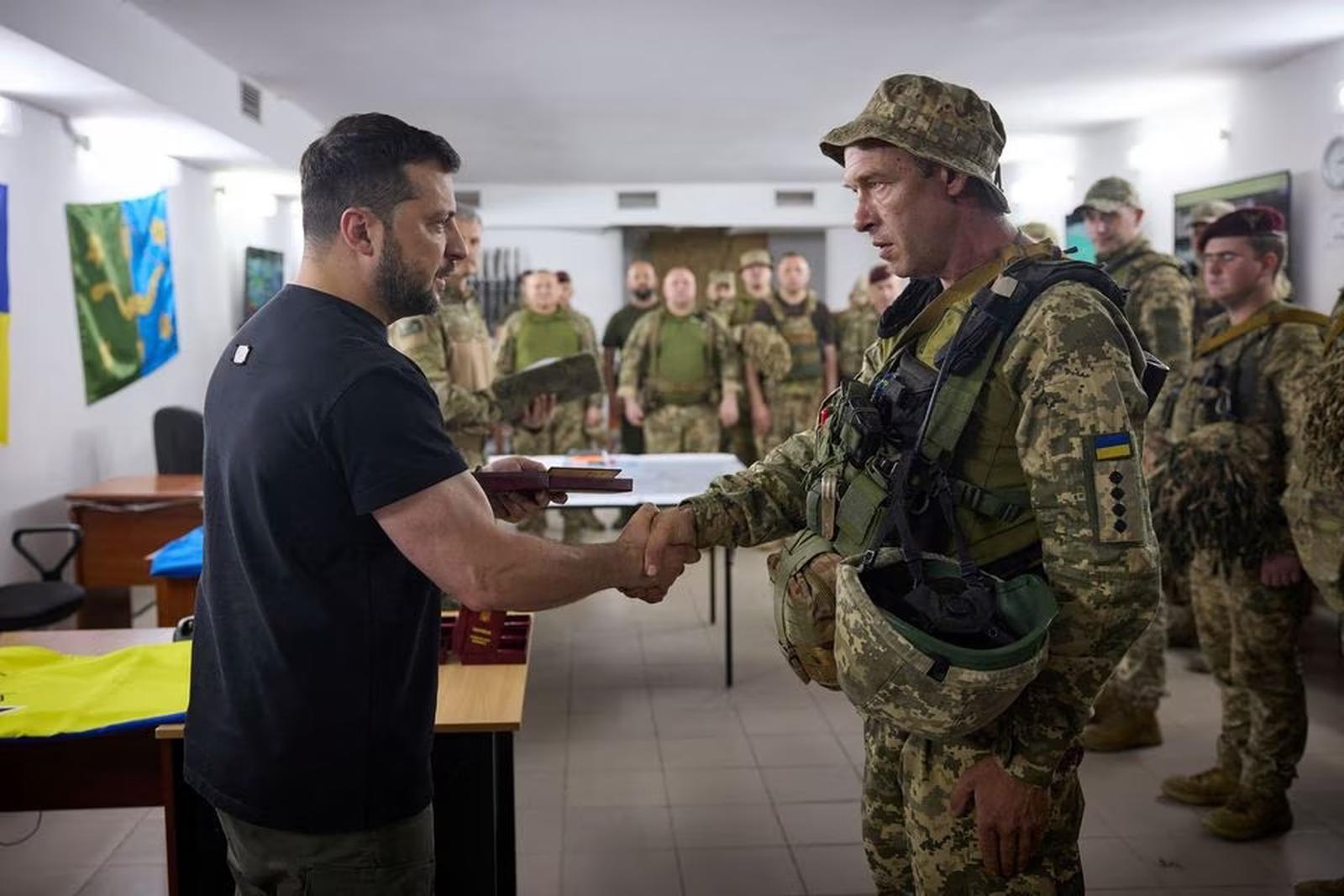 Tổng thống Ukraine Volodymyr Zelenskiy khen thưởng một quân nhân Ukraine khi ông đến thăm tiền tuyến, ngày 15/8/2023. Ảnh: Dịch vụ Báo chí của Tổng thống Ukraine/qua REUTERS