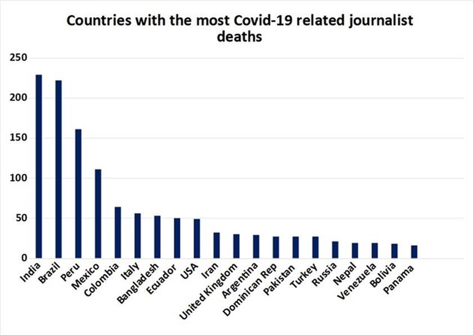 Sau Ấn Độ, các quốc gia khác nằm trong top 20 bị ảnh hưởng nặng nề nhất về số nhà báo chết vì Covid-19 là: Brazil (225), Peru (161), Mexico (112), Colombia (65), Ý (58), Bangladesh (53), Ecuador (51), Mỹ (49), Iran (32), Argentina (30), Vương quốc Anh (30), Cộng hòa Dominica (27), Pakistan (27), Thổ Nhĩ Kỳ (27), Nga (21), Venezuela (20), Nepal (19), Bolivia (18), Panama (16).