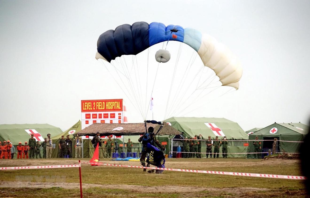 Lực lượng nhảy dù quân đội Campuchia tham gia diễn tập cứu hộ, cứu nạn với Việt Nam ngày 18/12/2019. (Ảnh: Trần Long/TTXVN)