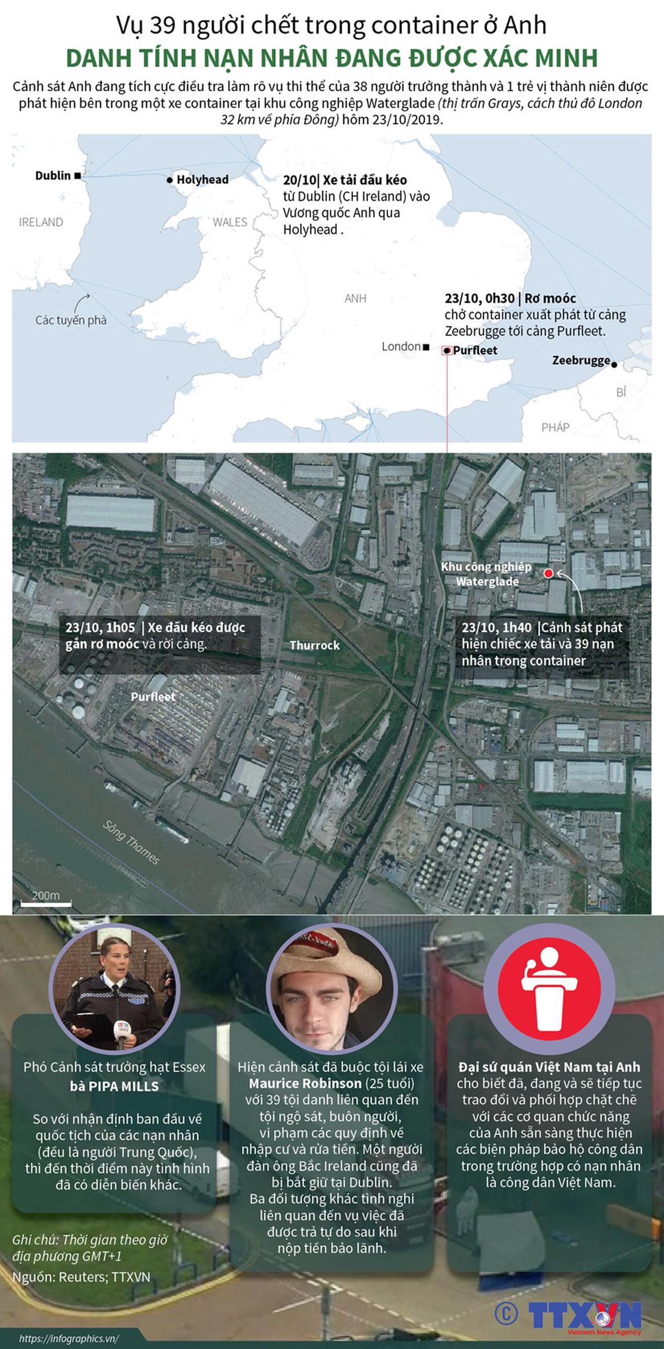 Cảnh sát Anh đang tích cực điều tra làm rõ vụ thi thể của 38 người trưởng thành và 1 trẻ vị thành niên được phát hiện bên trong một xe container tại khu công nghiệp Waterglade (thị trấn Grays, cách thủ đô London 32km về phía Đông) hôm 23/10./.
