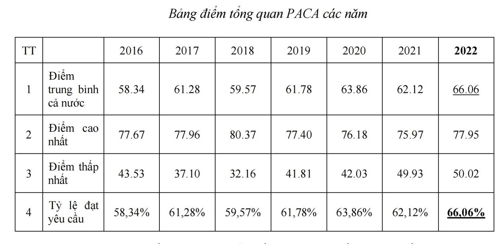 Bảng điểm tổng quan PACA từ năm 2016 đến 2022. Ảnh: TG