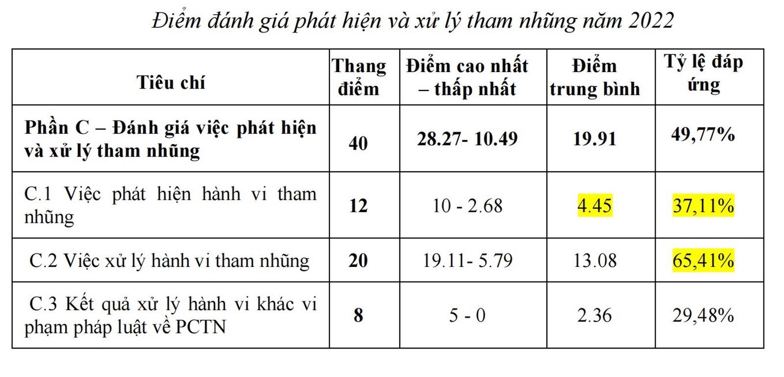 Bảng điểm đánh giá phát hiện và xử lý tham nhũng năm 2022. Ảnh: TG