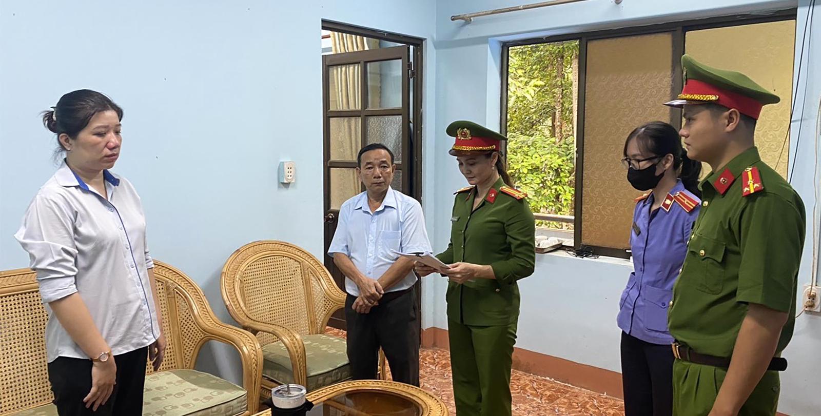 Cơ quan Cảnh sát điều tra, Công an huyện Lộc Ninh đọc lệnh khám xét, bắt tạm giam bị can Nguyễn Đỗ Thúy Anh. Ảnh: Báo Bình Phước