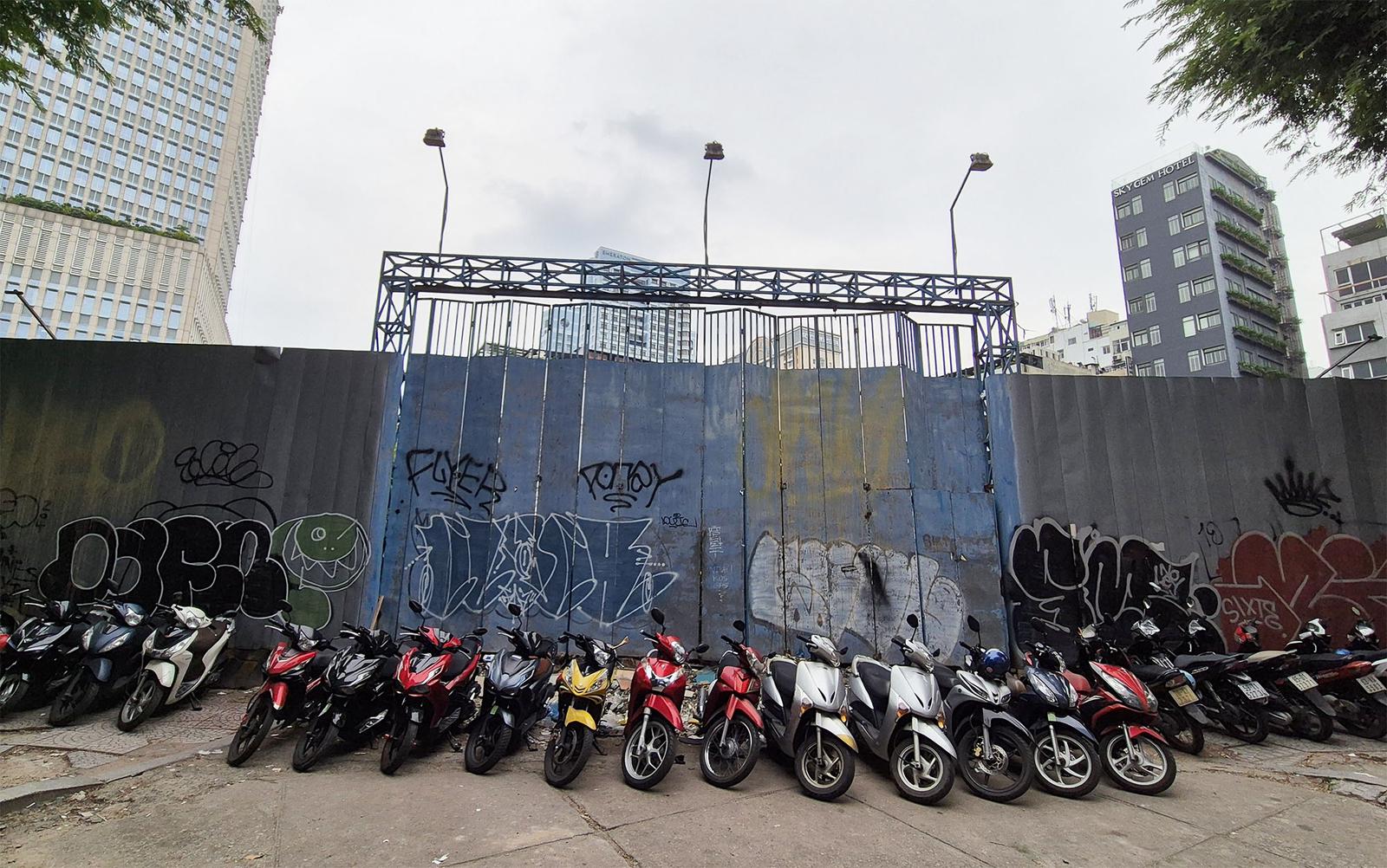 Bên hông khu đất là vỉa hè đường Thi Sách được dùng làm nơi giữ xe máy. Ảnh: CN