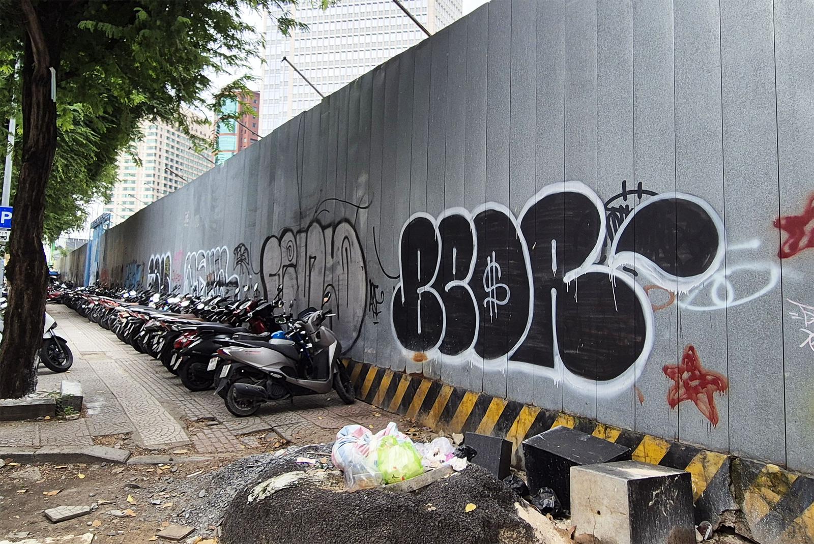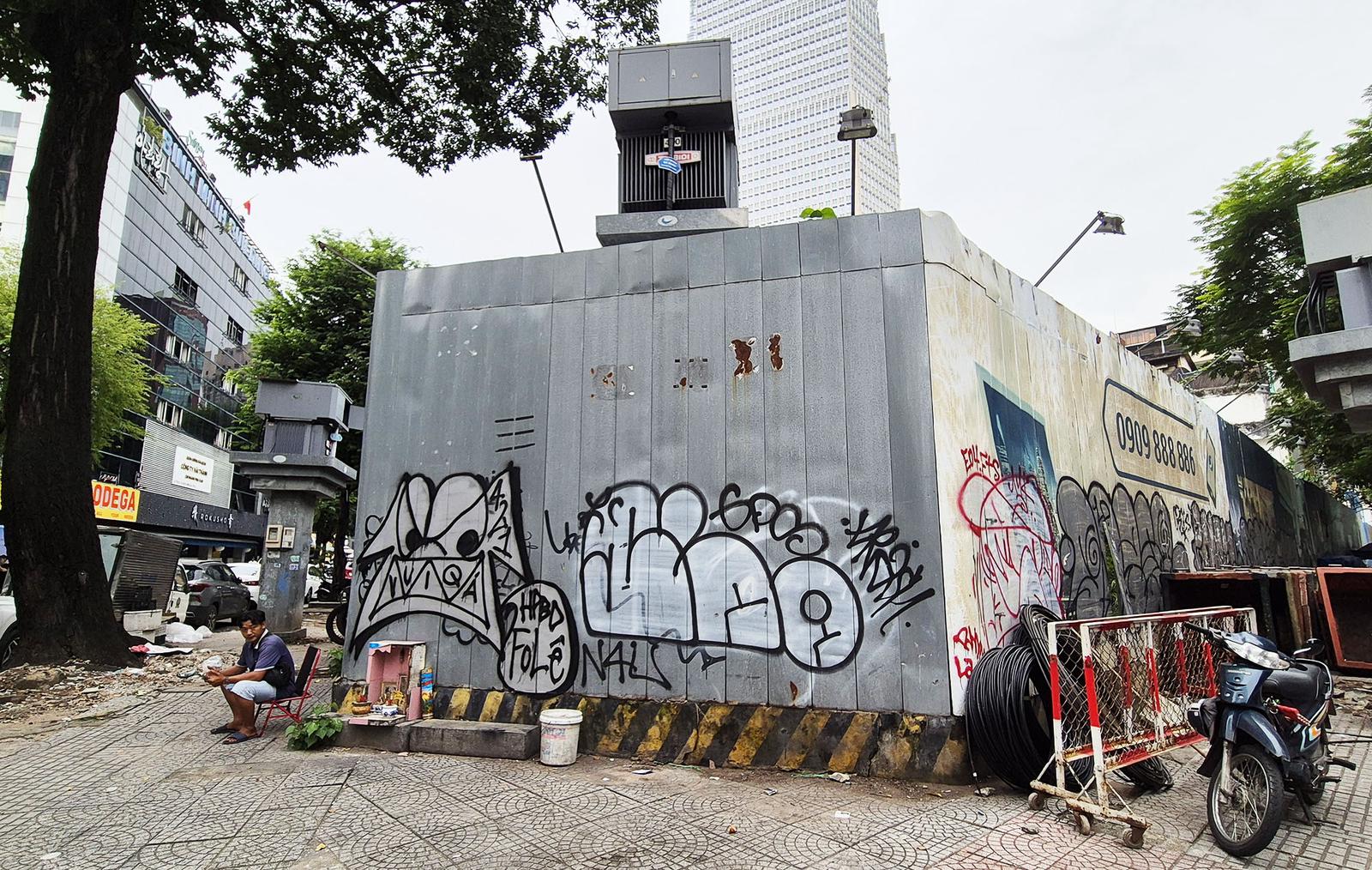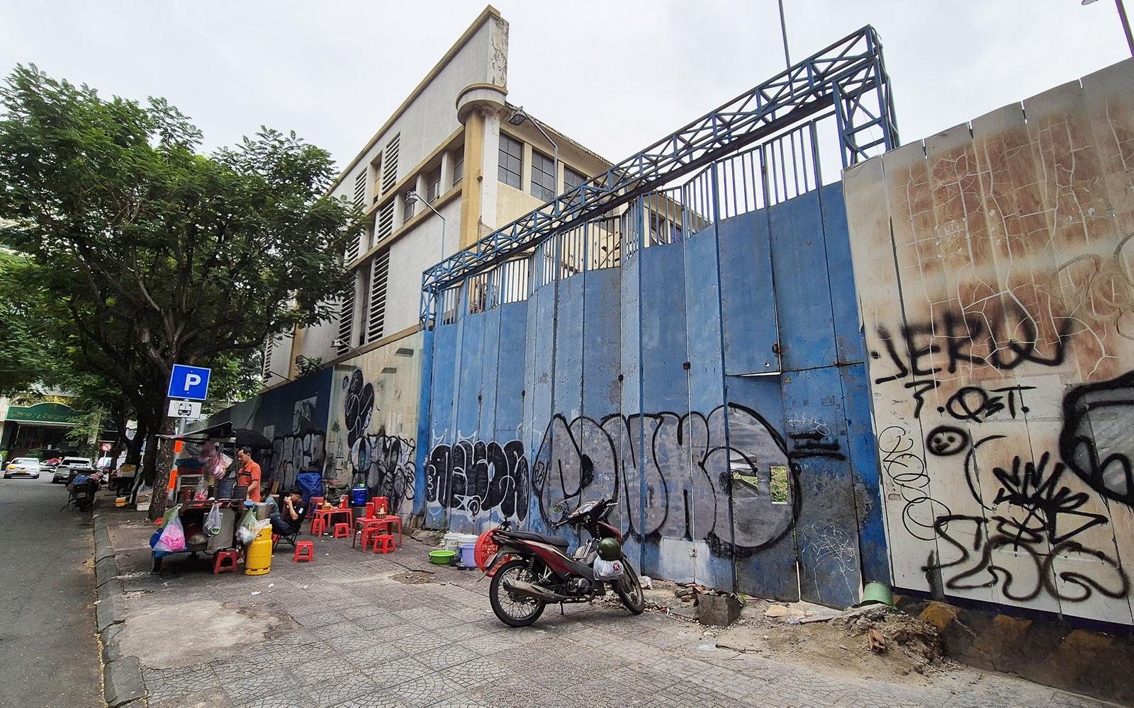 Khu đất đã được rào chắn, các bức tường bị vẽ bậy nhếch nhác. Ảnh: CN