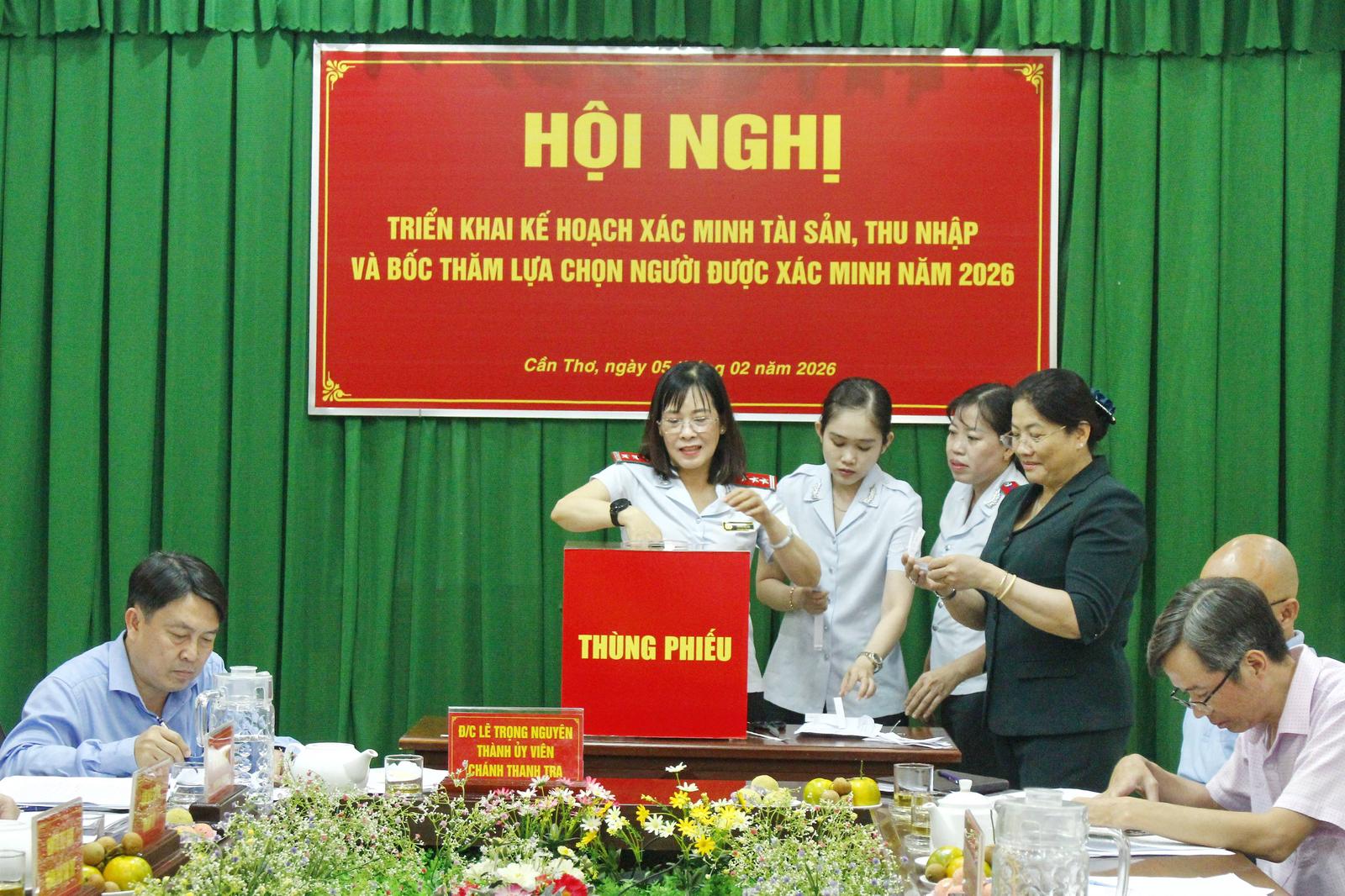 Các đại biểu chứng kiến Thanh tra TP bốc thăm lựa chọn ngẫu nhiên người được xác minh tài sản thu nhập. Ảnh: Thanh tra TP Cần Thơ
