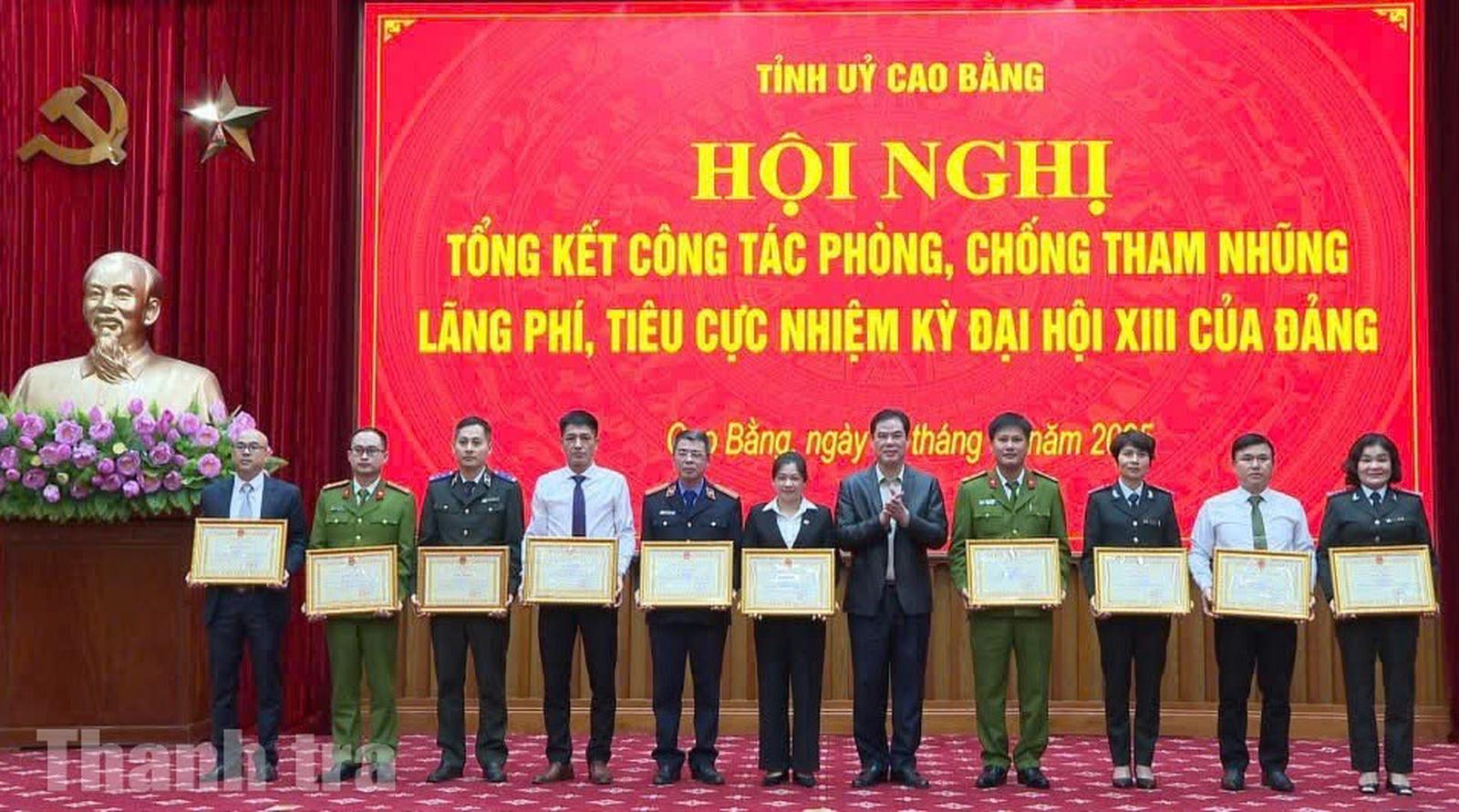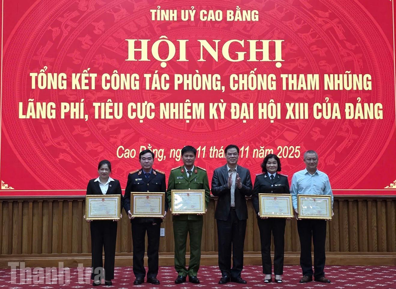 Tại hội nghị, đã công bố quyết định khen thưởng của Chủ tịch UBND tỉnh Cao Bằng đối với 5 tập thể và 10 cá nhân có thành tích tiêu biểu trong công tác PCTN, lãng phí, tiêu cực nhiệm kỳ qua. Trong đó, tập thể Thanh tra tỉnh Cao Bằng, Chánh Thanh tra tỉnh Nguyễn Thị Ánh Hồng và Phó Chánh Thanh tra tỉnh Trịnh Thị Xuân Thu vinh dự nhận Bằng khen – khẳng định vai trò, vị thế và đóng góp nổi bật của lực lượng thanh tra trong toàn hệ thống chính trị tỉnh.