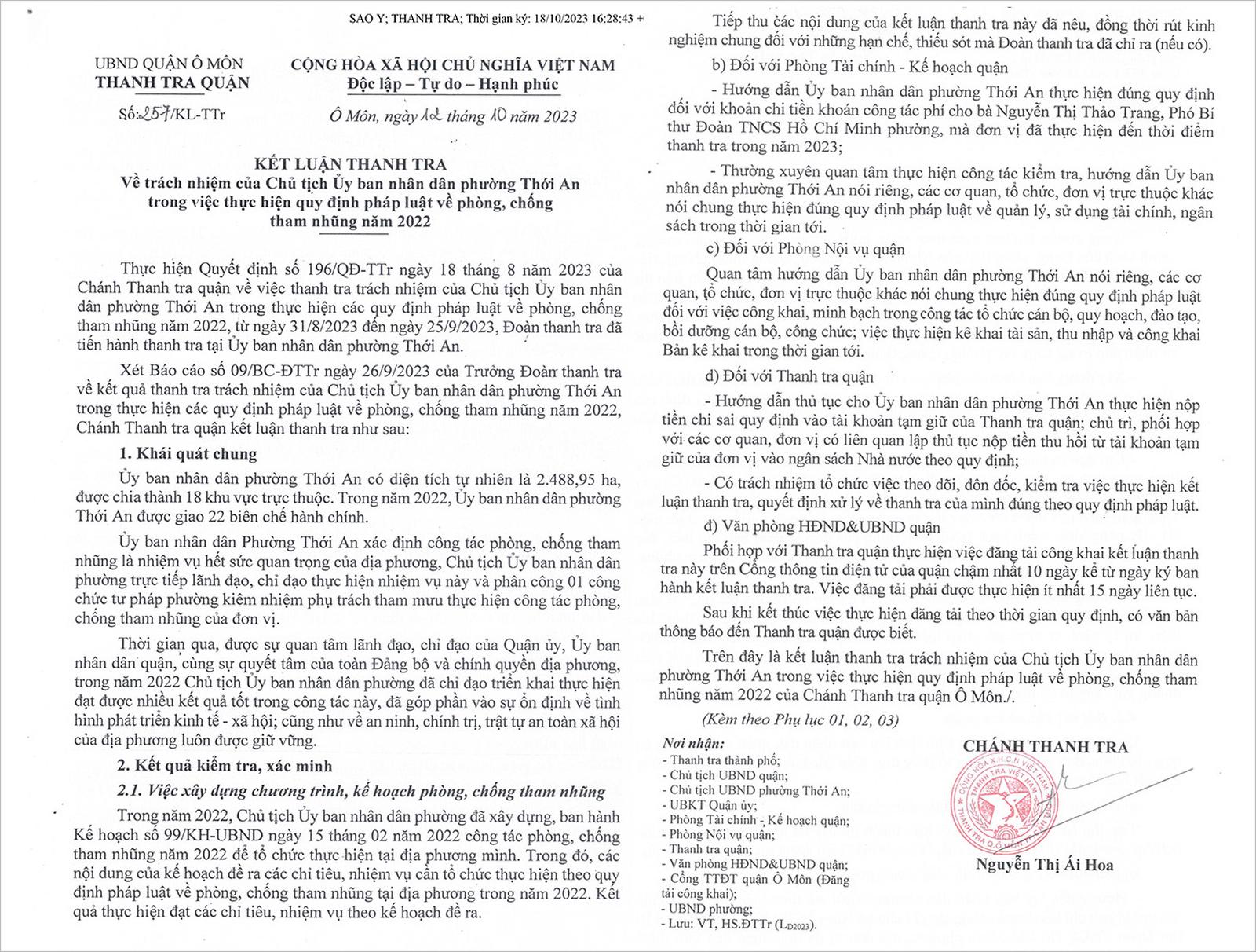 Ngày 12/10/2023, Thanh tra quận Ô Môn, TP Cần Thơ đã ban hành Kết luận số 257/KL-TTr về thanh tra trách nhiệm của Chủ tịch UBND phường Thới An trong việc thực hiện quy định pháp luật phòng, chống tham nhũng năm 2022.