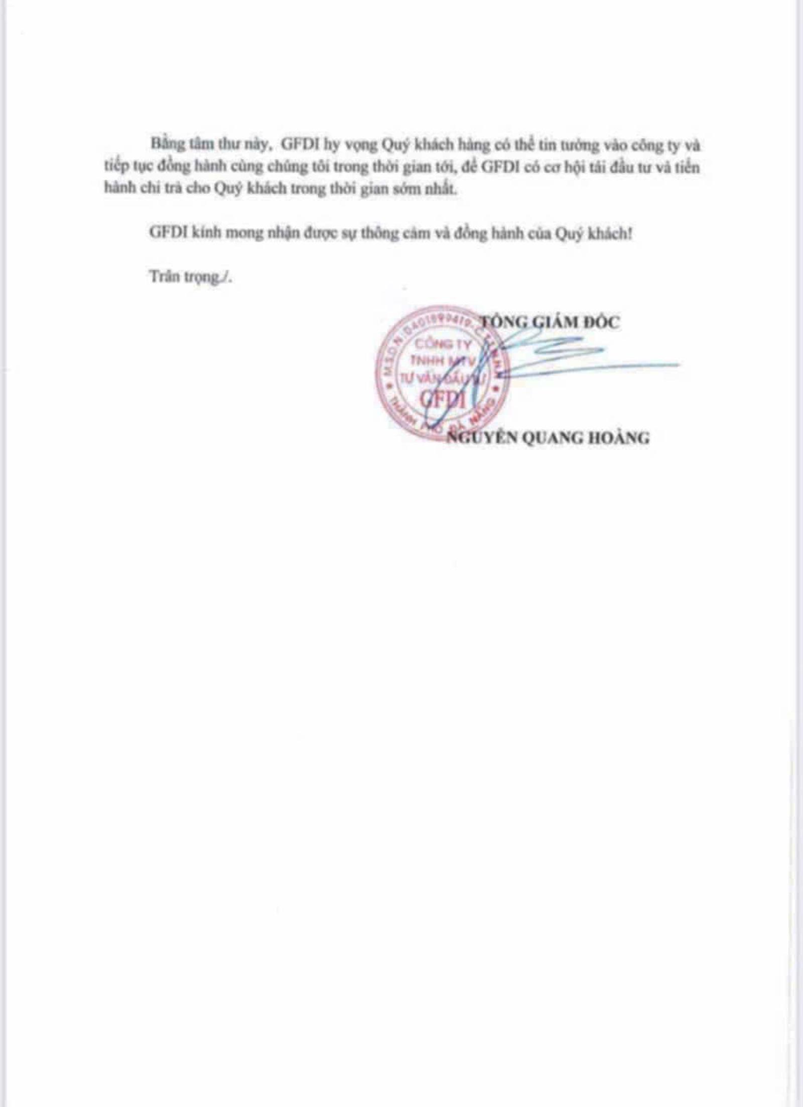 Trong văn bản này, ông Hoàng bày tỏ vì các mảng đầu tư của GFDI đã không còn mang lại lợi nhuận như kỳ vọng nên đang rà soát, tái thẩm định và sẽ tạm dừng những dự án đầu tư không còn khả năng sinh lợi tốt để đảm bảo quản lý tốt nhất nguồn vốn của khách hàng.