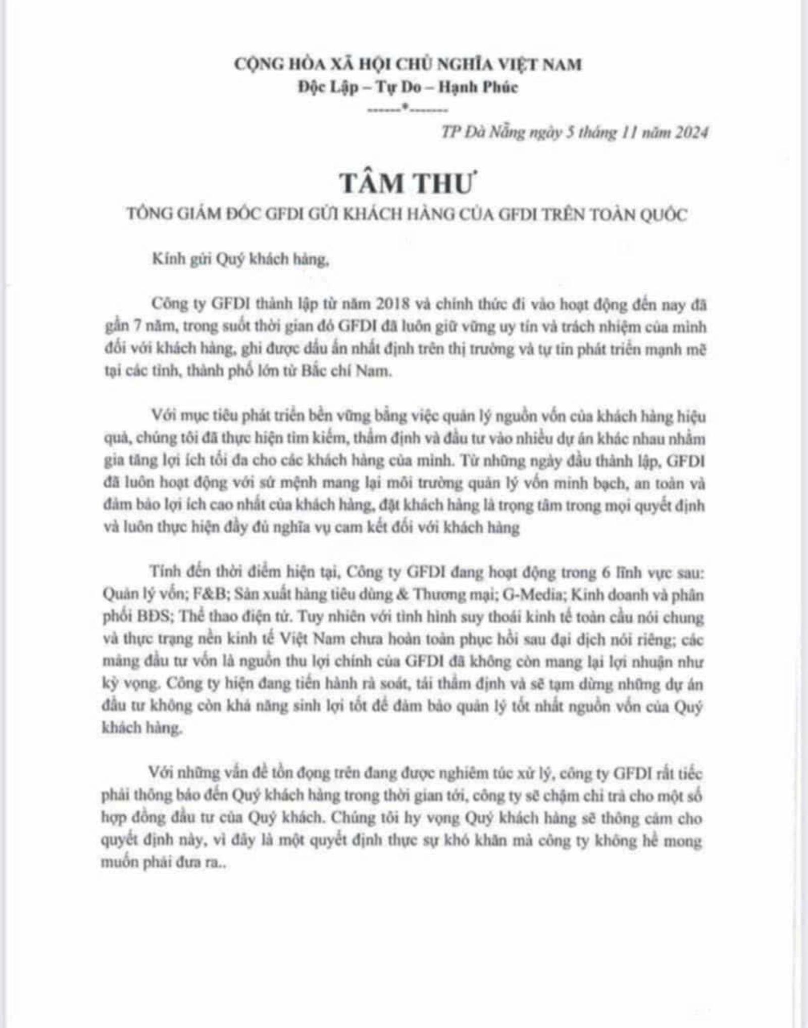 Trước đó, tối 5/11, mạng xã hội lan truyền tâm thư được cho là của ông Nguyễn Quang Hoàng - Tổng Giám đốc Công ty GFDI.