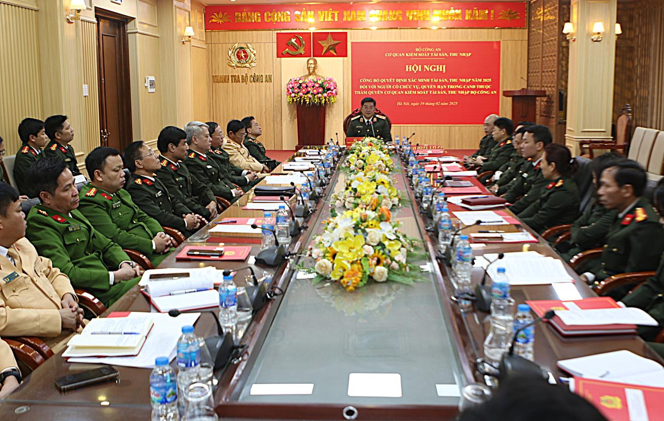 (Thanh tra) - Ngày 19/2/2025, Cơ quan Kiểm soát tài sản, thu nhập - Bộ Công an, đã tổ chức hội nghị công bố quyết định xác minh tài sản, thu nhập năm 2025 đối với người có chức vụ, quyền hạn trong Công an Nhân dân thuộc thẩm quyền Cơ quan Kiểm soát tài sản, thu nhập - Bộ Công an. Trung tướng Trần Đức Tuấn, Chánh Thanh tra Bộ Công an chủ trì hội nghị.