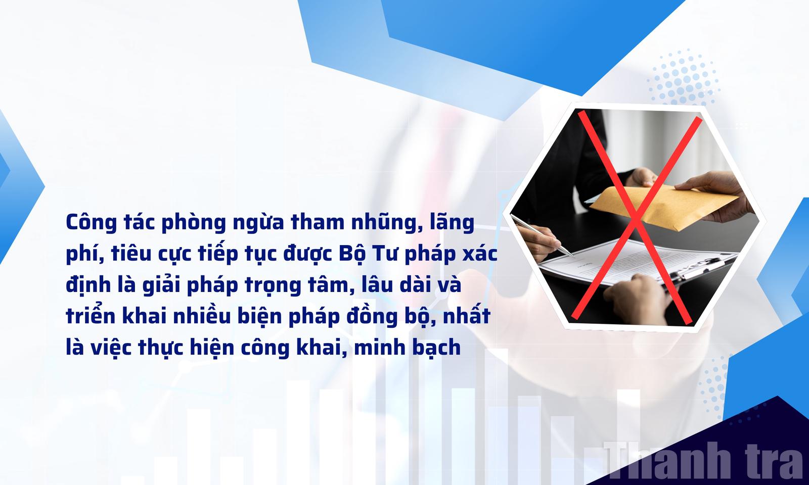 Công tác phòng ngừa tiếp tục được xác định là giải pháp trọng tâm, lâu dài. Bộ Tư pháp đã triển khai nhiều biện pháp đồng bộ, như thực hiện công khai, minh bạch trong tổ chức và hoạt động.