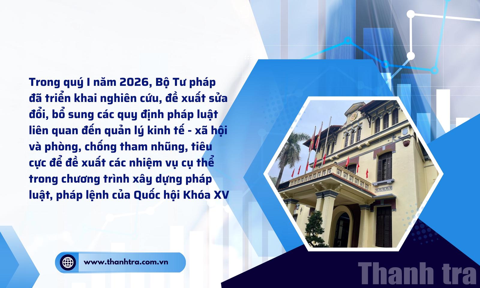 Theo đó, Bộ đã triển khai nghiên cứu, đề xuất sửa đổi, bổ sung các quy định pháp luật liên quan đến quản lý kinh tế - xã hội và phòng, chống tham nhũng, tiêu cực để đề xuất các nhiệm vụ cụ thể trong chương trình xây dựng pháp luật, pháp lệnh của Quốc hội Khóa XV.