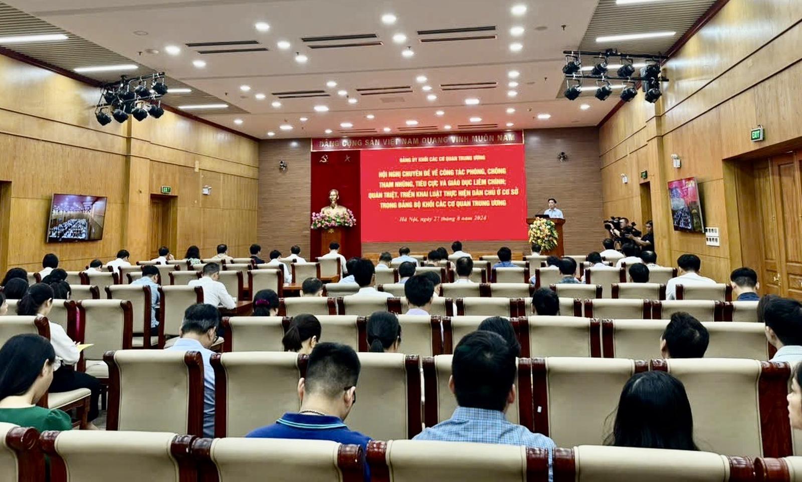Phát biểu bế mạc hội nghị, đồng chí Nguyễn Văn Thể, Bí thư Đảng uỷ Khối Các cơ quan Trung ương cho biết, trong thời gian qua, Bộ Chính trị, Ban Bí thư, Ban Chấp hành Trưng ương đã tăng cường chỉ đạo công tác xây dựng, chỉnh đốn Đảng, kiên quyết ngăn chặn, đẩy lùi và xử lý nghiêm minh những cán bộ, đảng viên suy thoái về tư tưởng chính trị, đạo đức, lối sống, biểu hiện “tự diễn biến” và tiếp tục đẩy mạnh công tác PCTN, tiêu cực một cách quyết liệt.