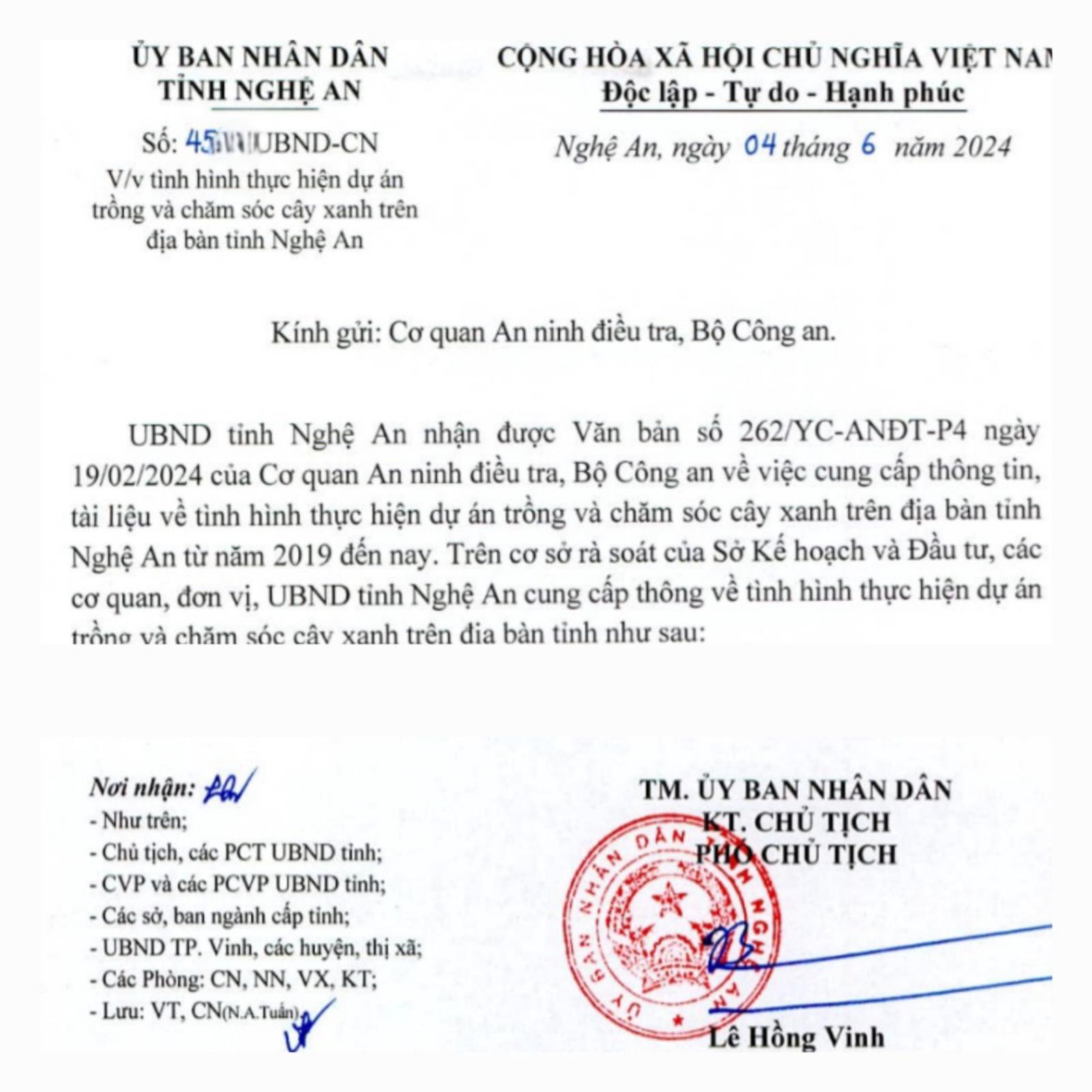 Trên cơ sở rà soát của Sở Kế hoạch và Đầu tư, các cơ quan, đơn vị, ngày 4/6/2024, UBND tỉnh Nghệ An đã thông tin đầy đủ về tình hình thực hiện dự án trồng và chăm sóc cây xanh trên địa bàn tỉnh từ năm 2019 đến nay để Cơ quan ANĐT thực hiện nhiệm vụ.
