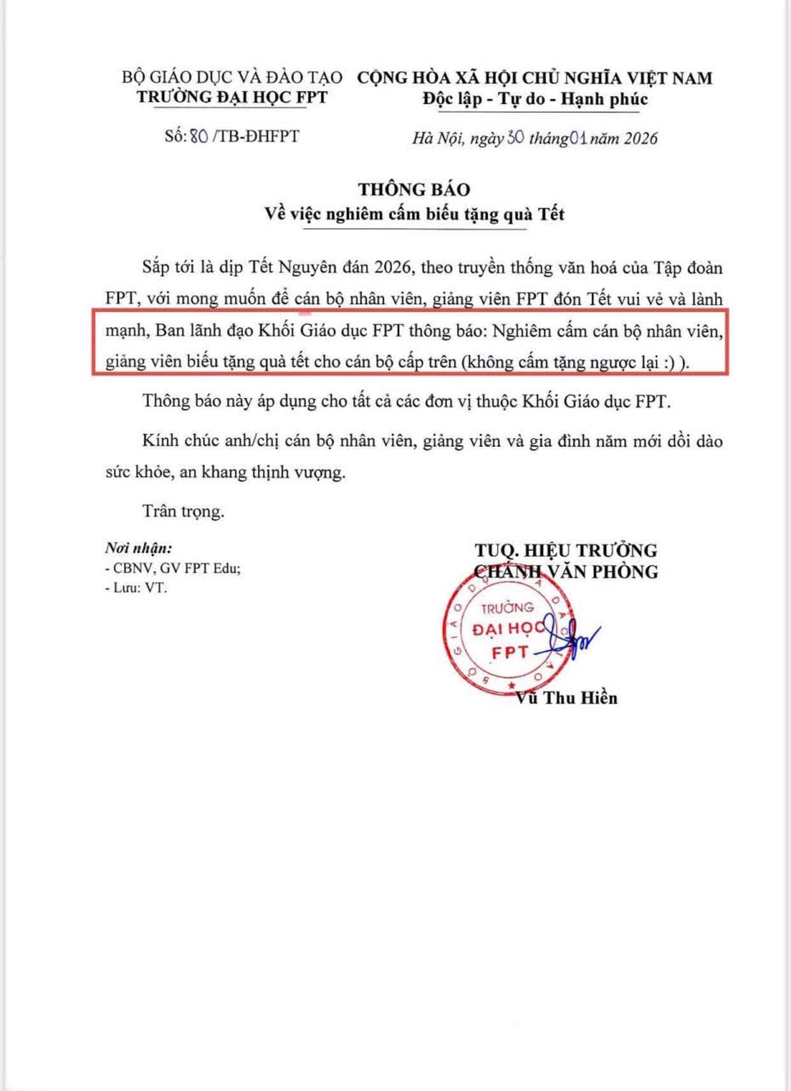 Trong những ngày cuối năm, khi câu chuyện quà cáp, lễ nghĩa lại trở thành mối bận tâm của không ít gia đình, cơ quan, đơn vị, một công văn ngắn gọn của Đại học FPT về việc nghiêm cấm giáo viên biếu quà cấp trên (trong khi không đặt ra yêu cầu hay nghĩa vụ ngược lại) đã gợi ra nhiều suy ngẫm đáng giá.