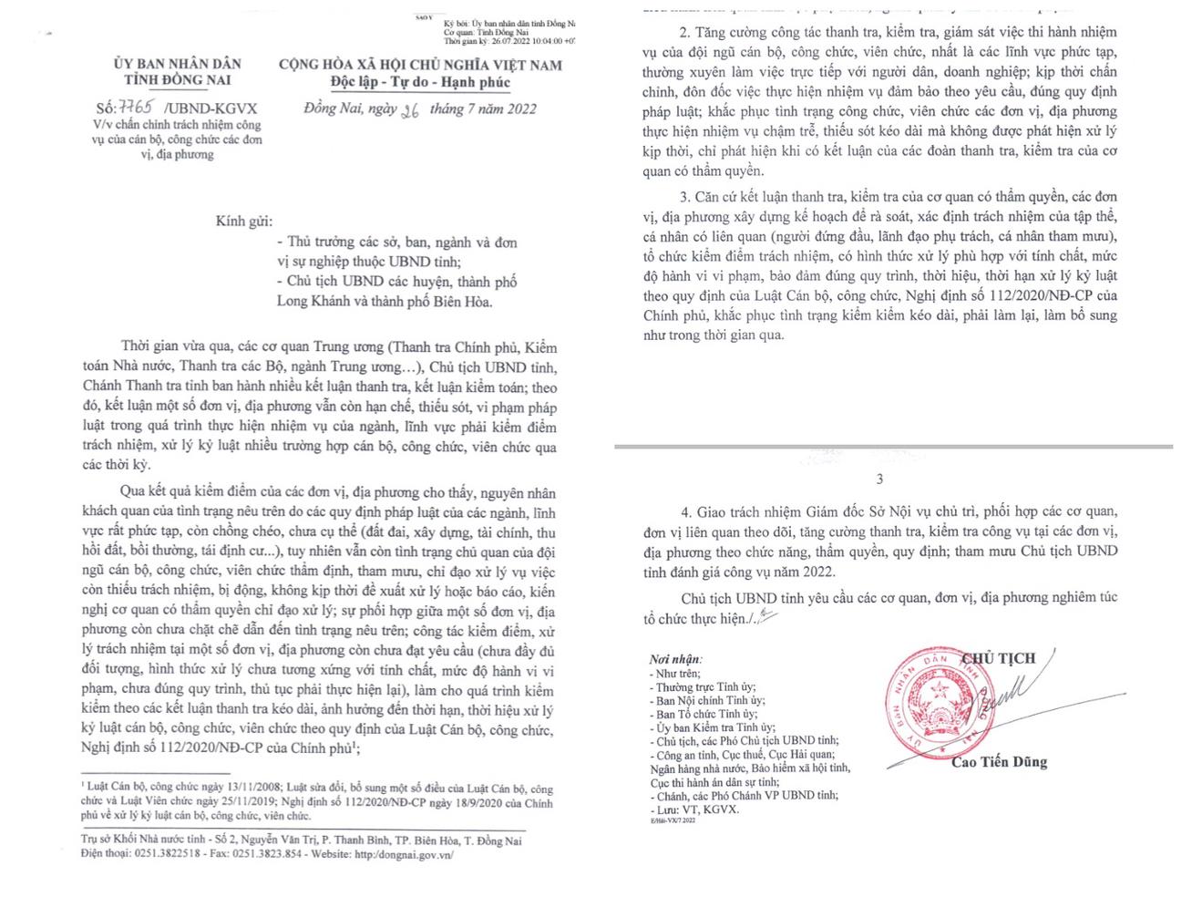 Chủ tịch UBND tỉnh Đồng Nai giao trách nhiệm Giám đốc Sở Nội vụ chủ trì, phối hợp các cơ quan, đơn vị liên quan theo dõi, tăng cường thanh tra, kiểm tra công vụ tại các đơn vị, địa phương theo chức năng, thẩm quyền, quy định; tham mưa Chủ tịch UBND tỉnh đánh giá công vụ năm 2022.