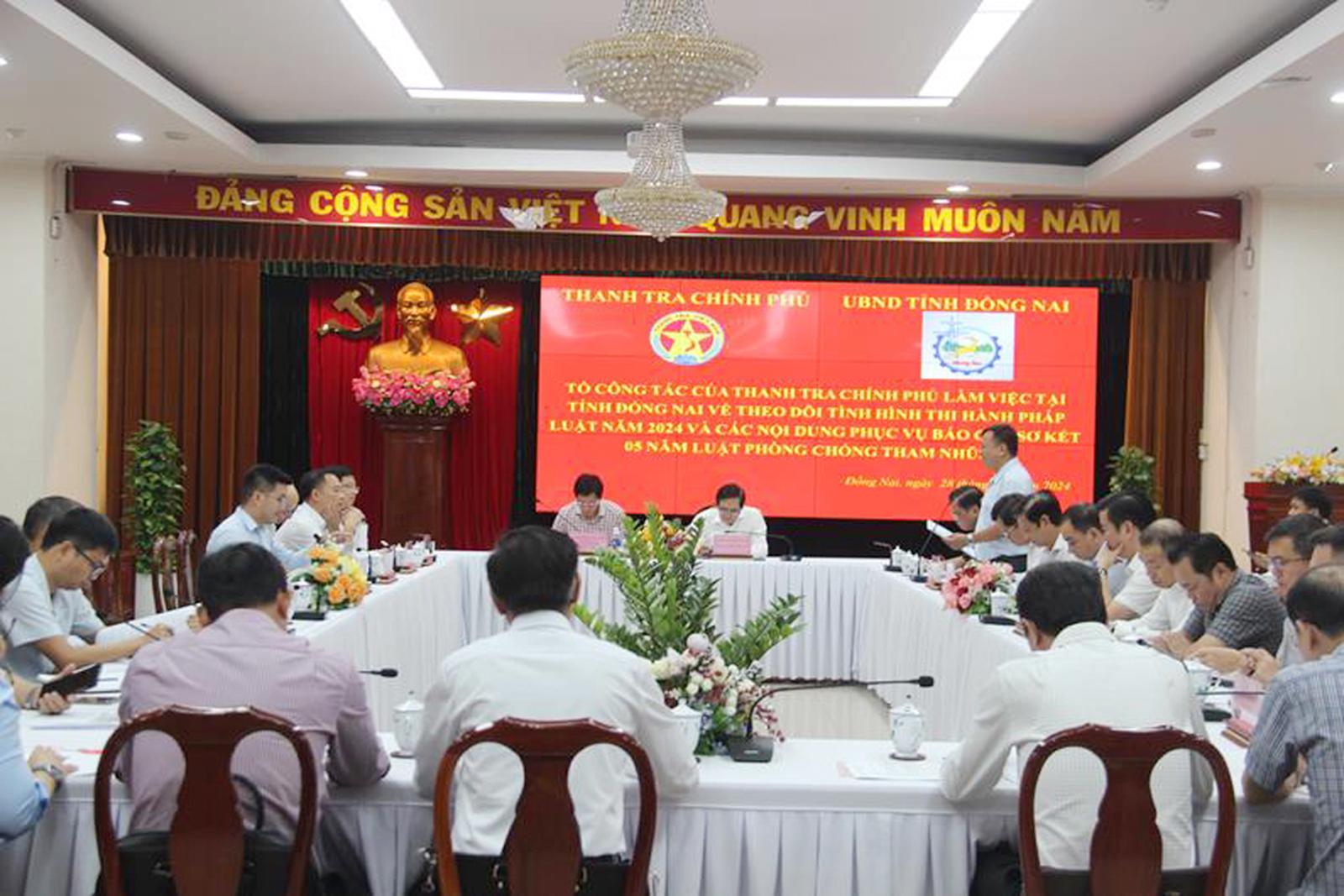 Tổ công tác của Thanh tra Chính phủ làm việc với tỉnh Đồng Nai về theo dõi tình hình thi hành pháp luật năm 2024 và các nội dung phục vụ báo cáo sơ kết 5 năm Luật PCTN. Ảnh: dongnai.gov.vn