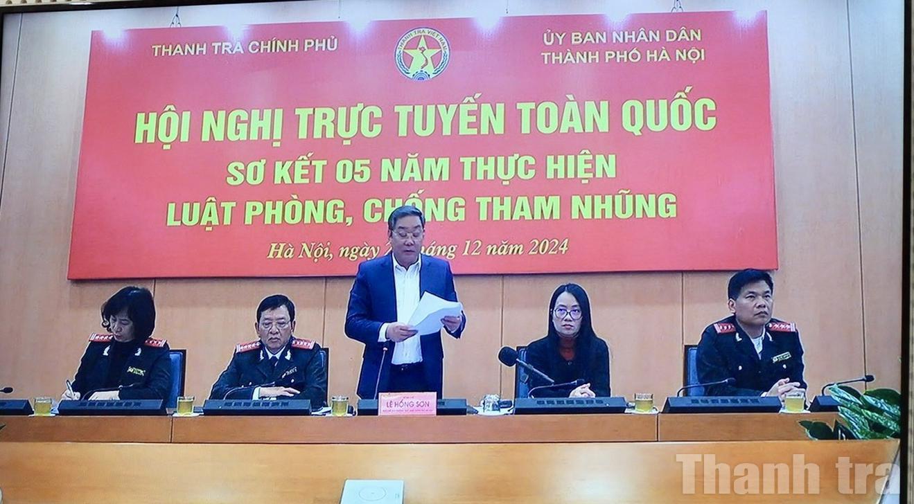 Phó Chủ tịch Thường trực UBND TP Hà Nội Lê Hồng Sơn tham luận tại hội nghị trực tuyến sơ kết 05 năm thực hiện Luật Phòng, chống tham nhũng. Ảnh: LP