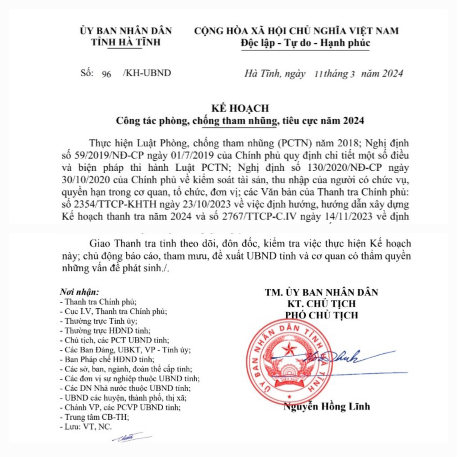 Kế hoạch PCTN, tiêu cực do UBND tỉnh Hà Tĩnh ban hành. Ảnh: Xuân Thống