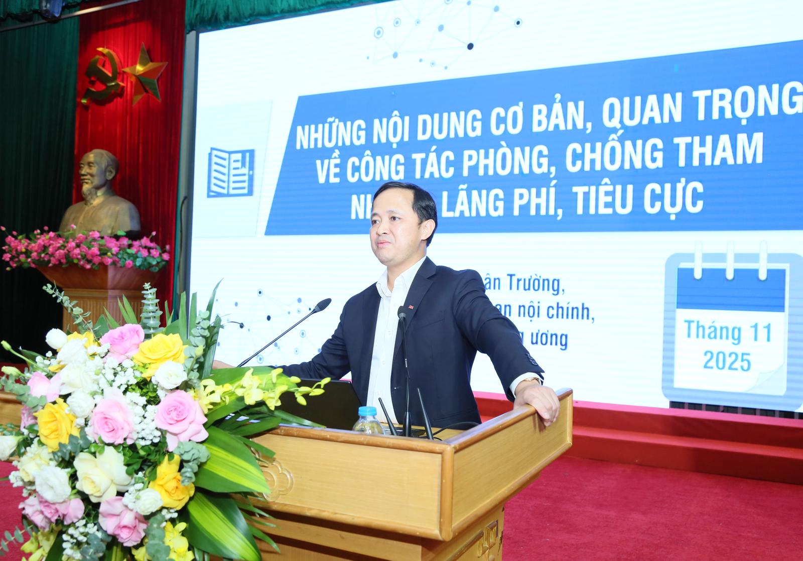 Tiến sĩ Nguyễn Xuân Trường, Vụ trưởng Vụ các Cơ quan Nội chính, Ban Nội chính Trung ương giới thiệu, truyền đạt các chuyên đề. Ảnh: Tất Đạt