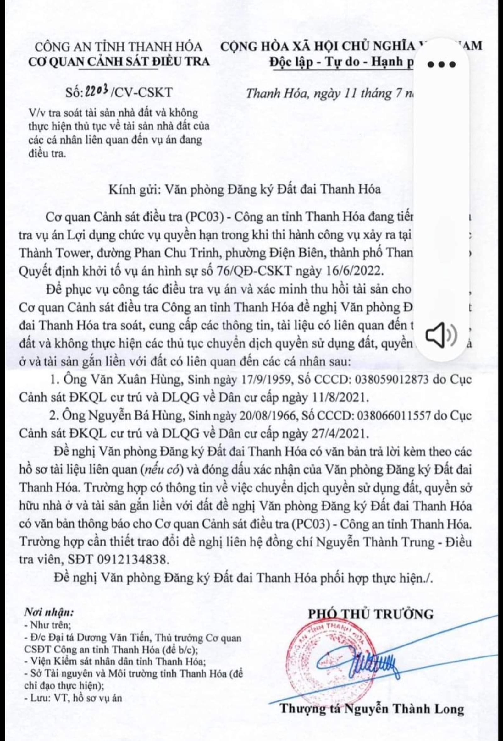 Văn bản đề nghị tra soát tài sản nhà đất của ông Văn Xuân Hùng và Nguyễn Bá Hùng liên quan đến dự án Hạc Thành Tower, phường Điện Biên, TP Thanh Hóa. Ảnh: VT