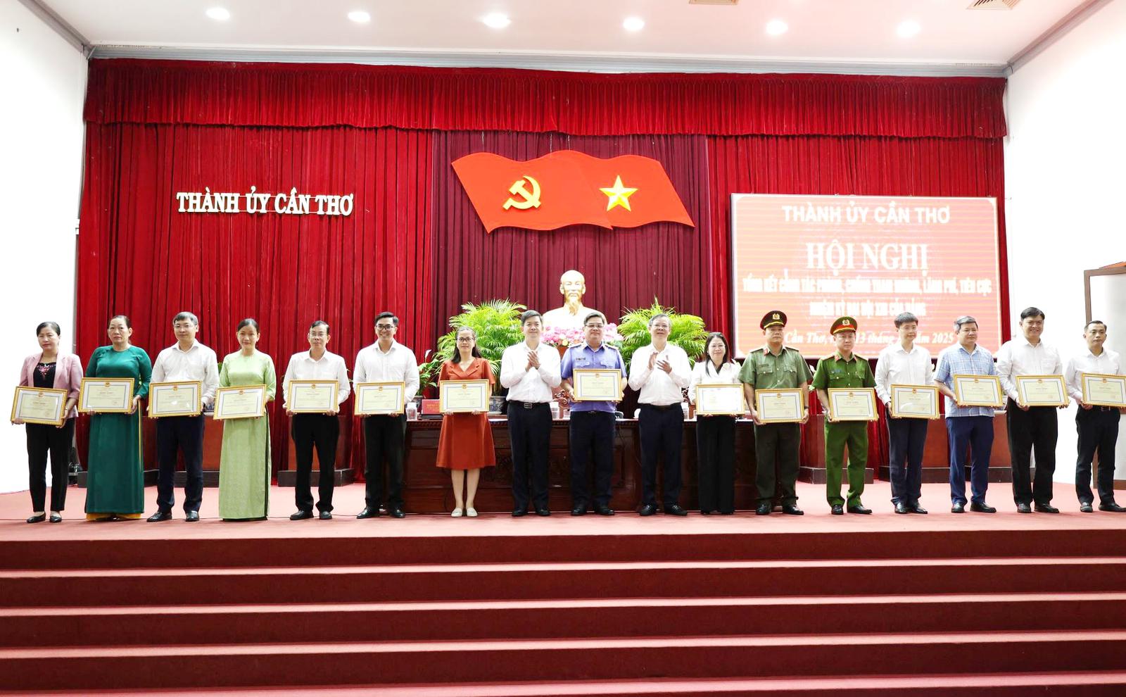 Chủ tịch UBND TP Cần Thơ Trương Cảnh Tuyên tặng bằng khen cho 15 tập thể và 20 cá nhân có thành tích trong công tác theo dõi, báo cáo và tham mưu cho UBND thành phố đối với công tác phòng, chống tham nhũng, lãng phí, tiêu cực. Ảnh: Ngọc Phạm
