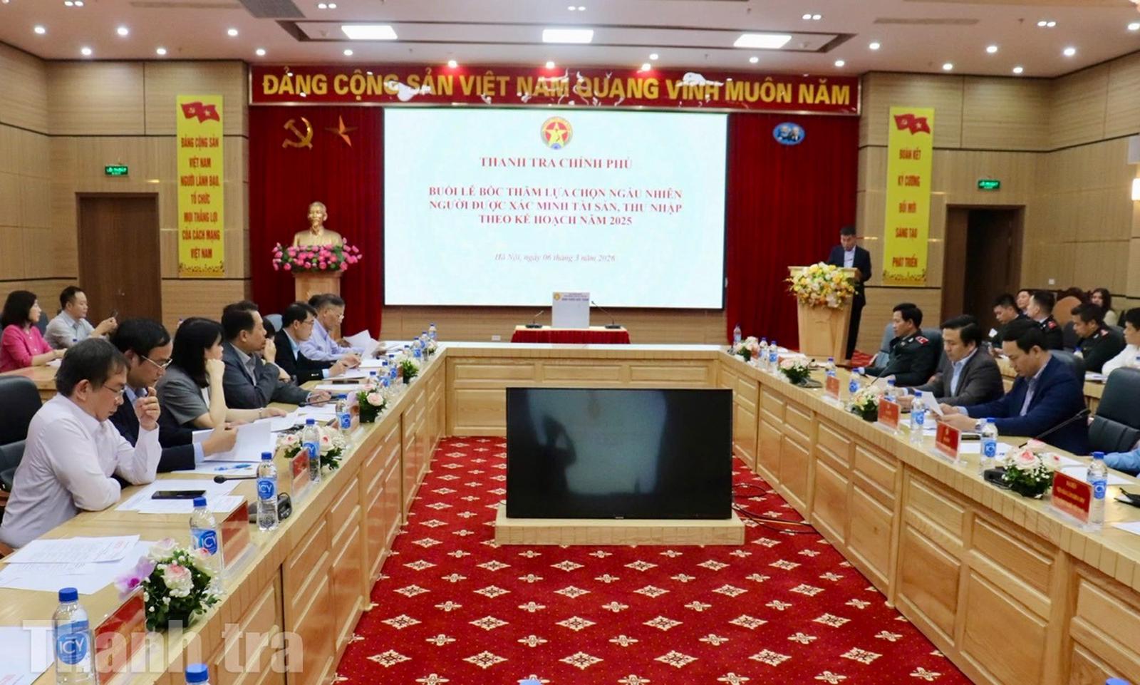 Theo đó, Thanh tra Chính phủ tiến hành bốc thăm lựa chọn trong số 240 người có nghĩa vụ kê khai tài sản, thu nhập thuộc thẩm quyền kiểm soát của cơ quan, đang công tác tại 9 cơ quan, tổ chức, đơn vị, gồm: Bộ Tài chính, Bộ Ngoại giao, Bộ Dân tộc và Tôn giáo, Đài Tiếng nói Việt Nam, Thông tấn xã Việt Nam, Viện Hàn lâm Khoa học và Công nghệ Việt Nam, Viện Hàn lâm Khoa học Xã hội Việt Nam, Đại học Quốc gia Hà Nội và Ngân hàng Phát triển Việt Nam, nhằm lựa chọn 27 người để thực hiện xác minh tài sản, thu nhập theo kế hoạch năm 2025.