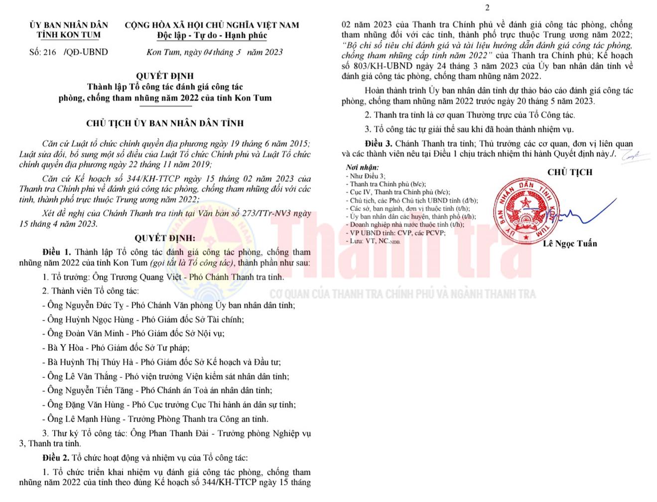 Theo Quyết định số 216/QĐ-UBND của UBND tỉnh Kon Tum, Thanh tra tỉnh là Cơ quan Thường trực của Tổ Công tác đánh giá công tác PCTN.