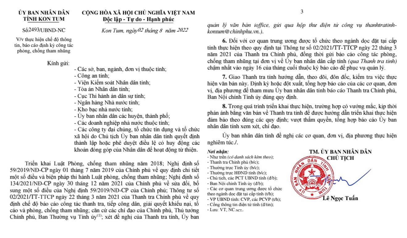 UBND tỉnh Kon Tum yêu cầu các sở, ban, ngành; UBND các huyện, TP; các đơn vị sự nghiệp thuộc UBND tỉnh; các doanh nghiệp Nhà nước thuộc UBND tỉnh và các đơn vị liên quan theo chức năng nhiệm vụ của ngành, địa phương báo cáo định kỳ kết quả công tác phòng, chống tham nhũng theo mẫu đề cương báo cáo và các biểu số liệu đã được quy định.