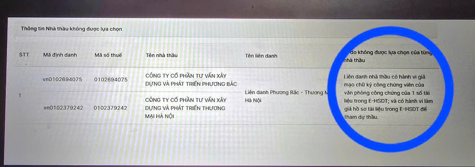 Do đó, tổ chuyên gia kết luận, một số hồ sơ, tài liệu trong HSDT của 2 liên danh nhà thầu nêu trên không có giá trị pháp lý; 2 liên danh nhà thầu có hành vi làm giả hồ sơ, tài liệu trong HSDT để tham dự thầu, vi phạm điểm a, khoản 4, Điều 16 Luật Đấu thầu năm 2023.