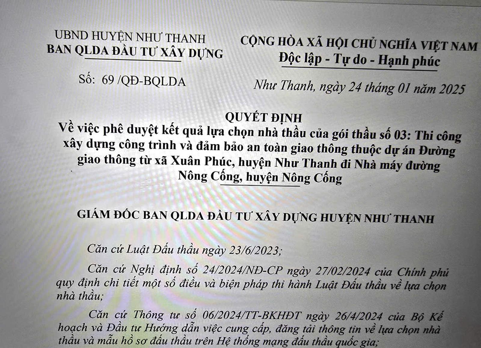 Quyết định lựa chọn nhà thầu của gói thầu số 03 thi công xây dựng công trình và đảm bảo an toàn giao thông thuộc đường giao thông xã Xuân Phúc, huyện Như Thanh đi Nhà máy đường huyện Nông Cống. Ảnh: P,V
