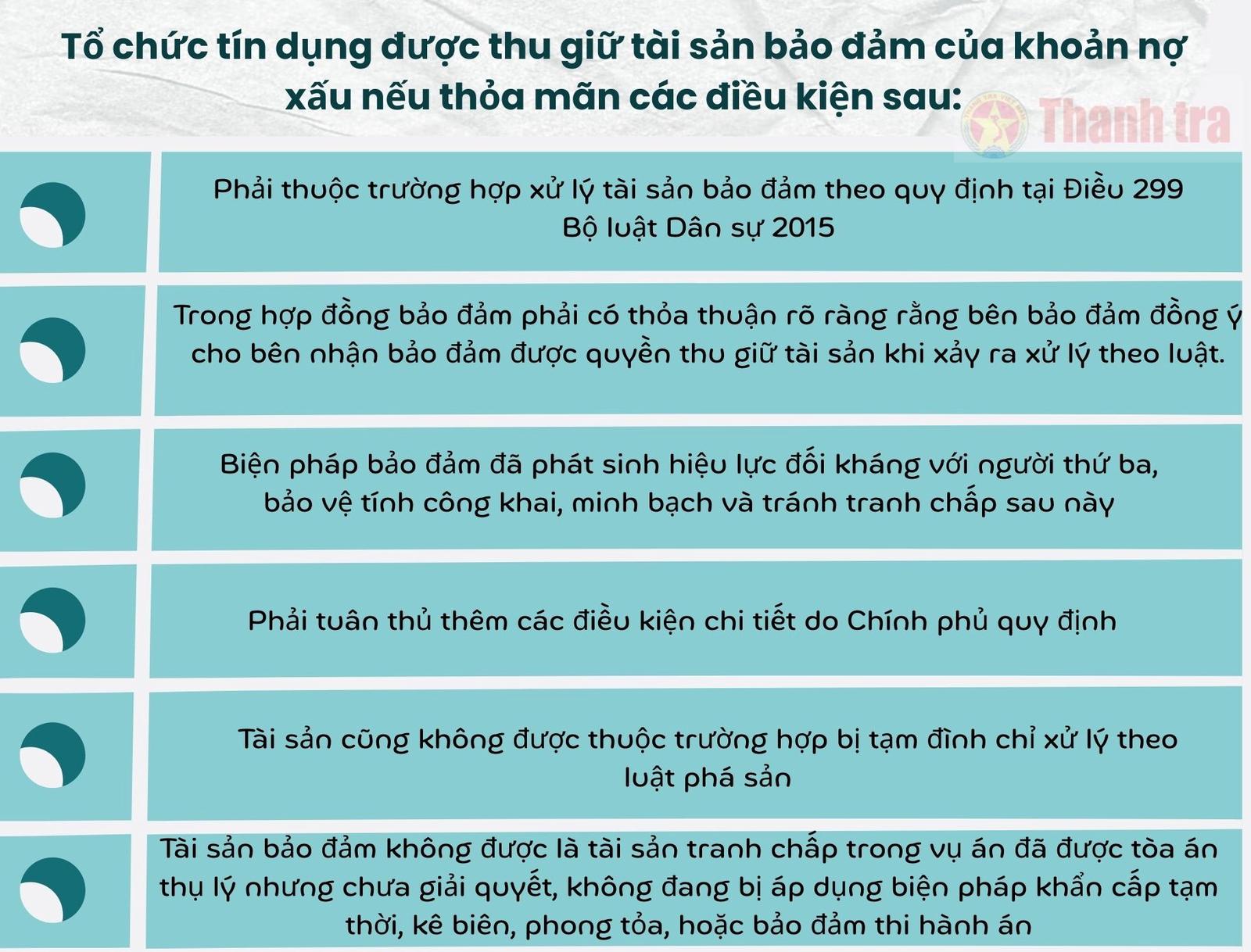 Trong bối cảnh Việt Nam đang đẩy mạnh kiểm soát tài sản, thu nhập của cán bộ, công chức, người có chức vụ, quy định thu giữ tài sản bảo đảm khi xử lý nợ xấu còn có ý nghĩa gián tiếp hỗ trợ cho việc truy soát, kiểm tra nguồn gốc tài sản.