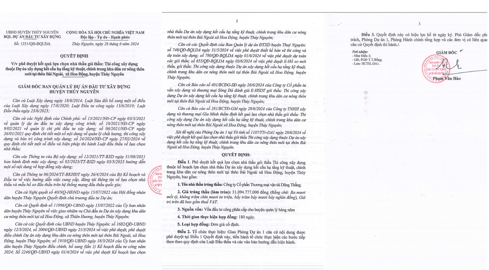 Quyết định phê duyệt kết quả lựa chọn nhà thầu của Ban Quản lý dự án đầu tư xây dựng huyện Thuỷ Nguyên. Ảnh: PV
