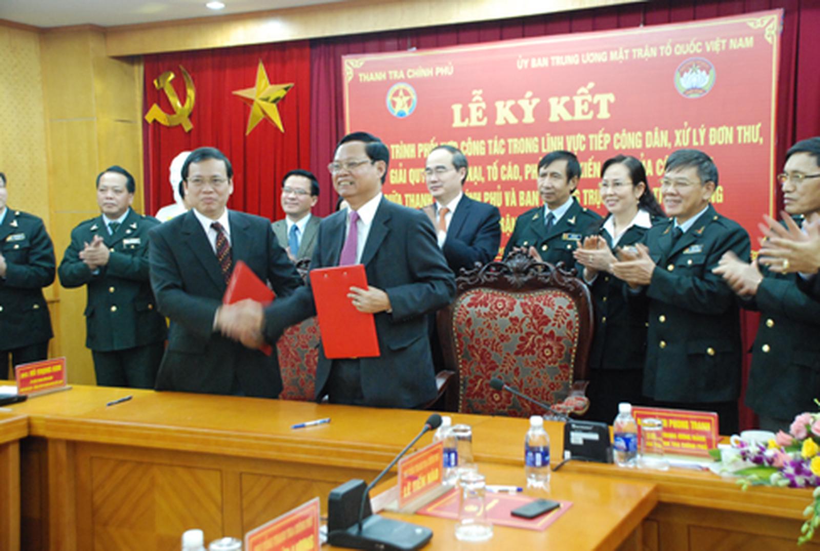 Thực hiện quy định của pháp luật trong đấu tranh phòng chống tham nhũng, năm 2014, Thanh tra Chính phủ đã ký chương trình phối hợp công tác trong lĩnh vực tiếp công dân, xử lý đơn thư, giải quyết khiếu nại tố cáo, kiến nghị, phản ánh của công dân với Ủy ban Trung ương MTTQ Việt Nam.
