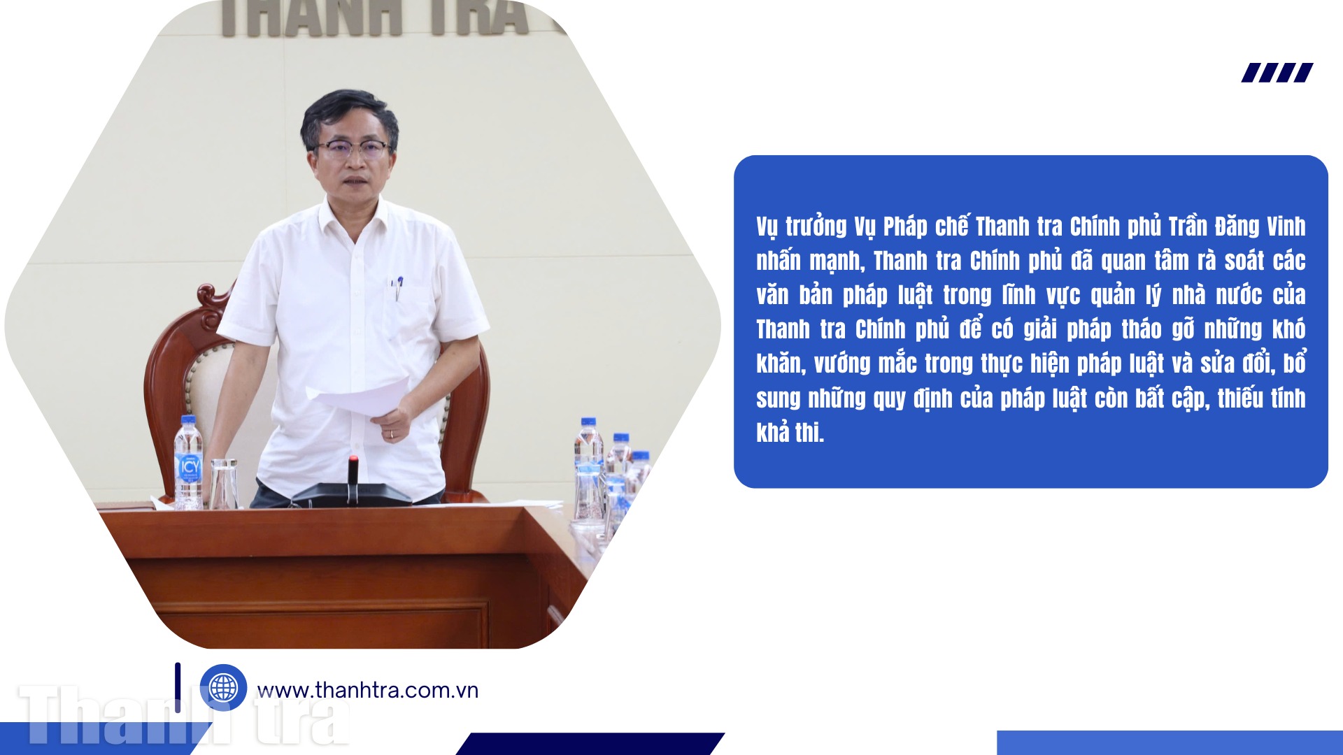 "Quá trình đó, Thanh tra Chính phủ đã quan tâm đến tháo gỡ “điểm nghẽn” của thể chế, theo đó, đã quan tâm rà soát các văn bản pháp luật trong lĩnh vực quản lý nhà nước của Thanh tra Chính phủ để có giải pháp tháo gỡ những khó khăn, vướng mắc trong thực hiện pháp luật và sửa đổi, bổ sung những quy định của pháp luật còn bất cập, thiếu tính khả thi", Vụ trưởng Vụ Pháp chế Thanh tra Chính phủ Trần Đăng Vinh nhấn mạnh.