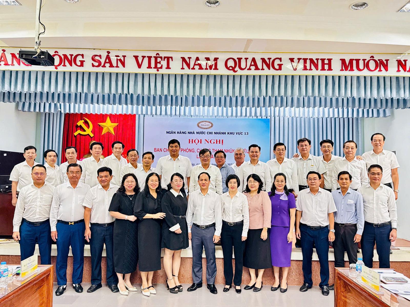 Ra mắt Ban Chỉ đạo: Đồng chí Phạm Minh Tú - Bí thư Đảng ủy, Giám đốc NHNN chi nhánh Khu vực 13, Trưởng Ban Chỉ đạo cùng các thành viên Ban Chỉ đạo gồm các giám đốc chi nhánh cấp 1 của các ngân hàng thương mại Nhà nước trên địa bàn. Ảnh: Anh Phương