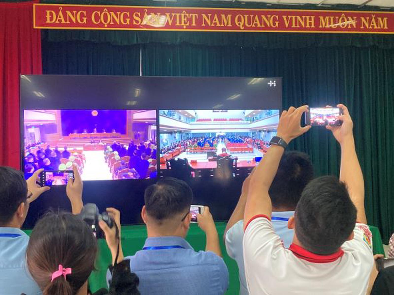 Phóng viên theo dõi trực tiếp phiên tòa qua màn hình TV đặt phía ngoài. Ảnh: Chí Cường